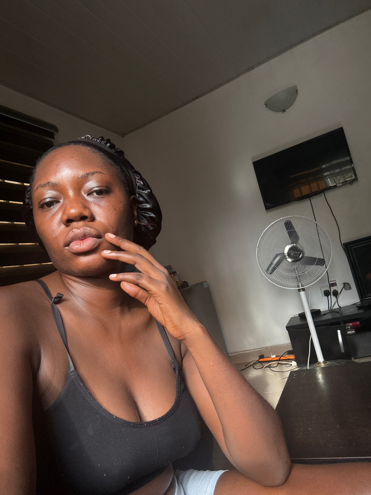 A woman lies indoors. She wears a black satin bonnet and a black bra. A standing fan, a television, and a wall-mounted light fixture are visible in the background. The location appears to be indoors,…read more
