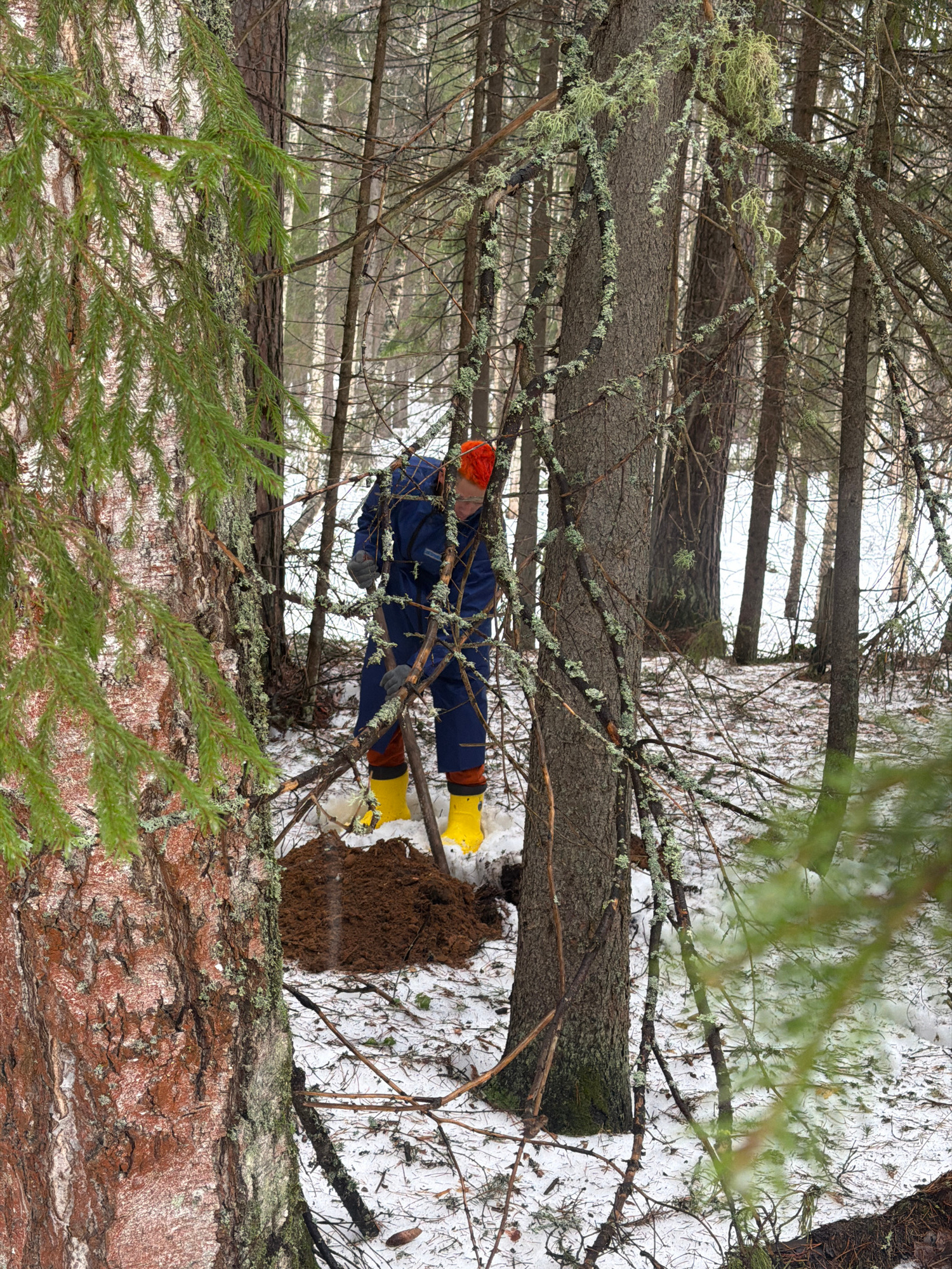 A person wearing an orange hat, blue jacket, and yellow boots is digging in the snow-covered ground within a wooded area. The area has numerous trees, some with visible moss on their branches. The envβ¦read more