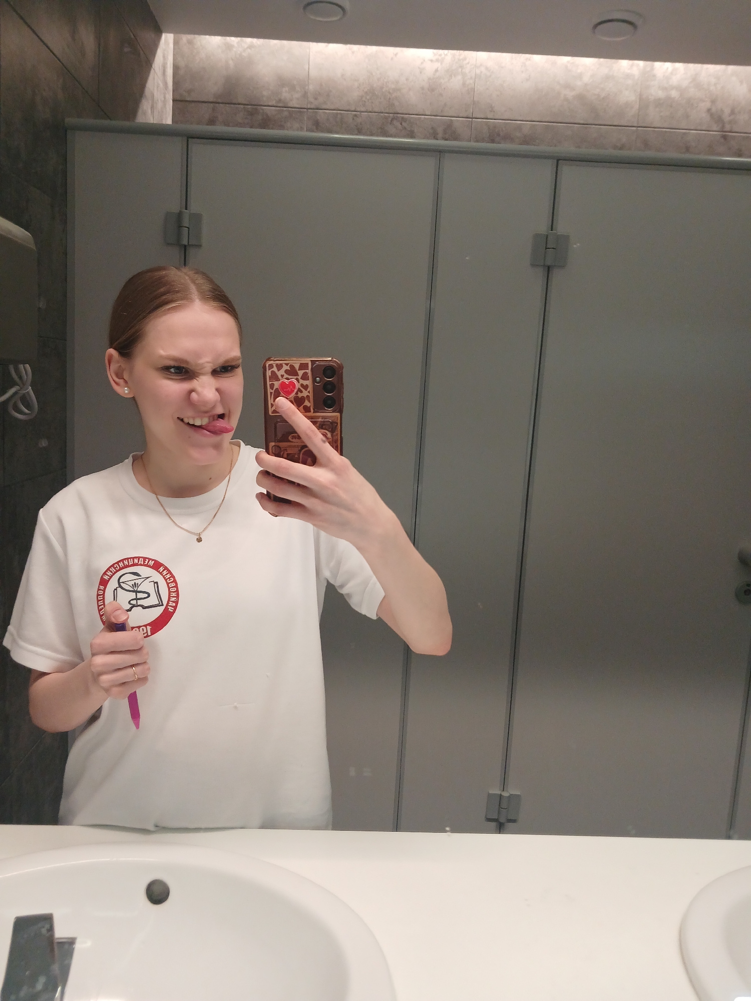 A young woman is taking a selfie in a bathroom, sticking her tongue out. She is holding a purple toothbrush in her left hand and a phone with a heart-patterned case in her right. She is wearing a whit…read more