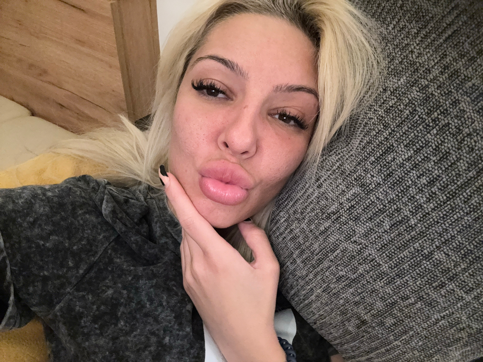 The image is a rotated, close-up portrait of a young woman lying down in an indoor setting. Her blonde hair frames her face, which is slightly tilted. She has dark brown eyes with prominent eyelashes…read more