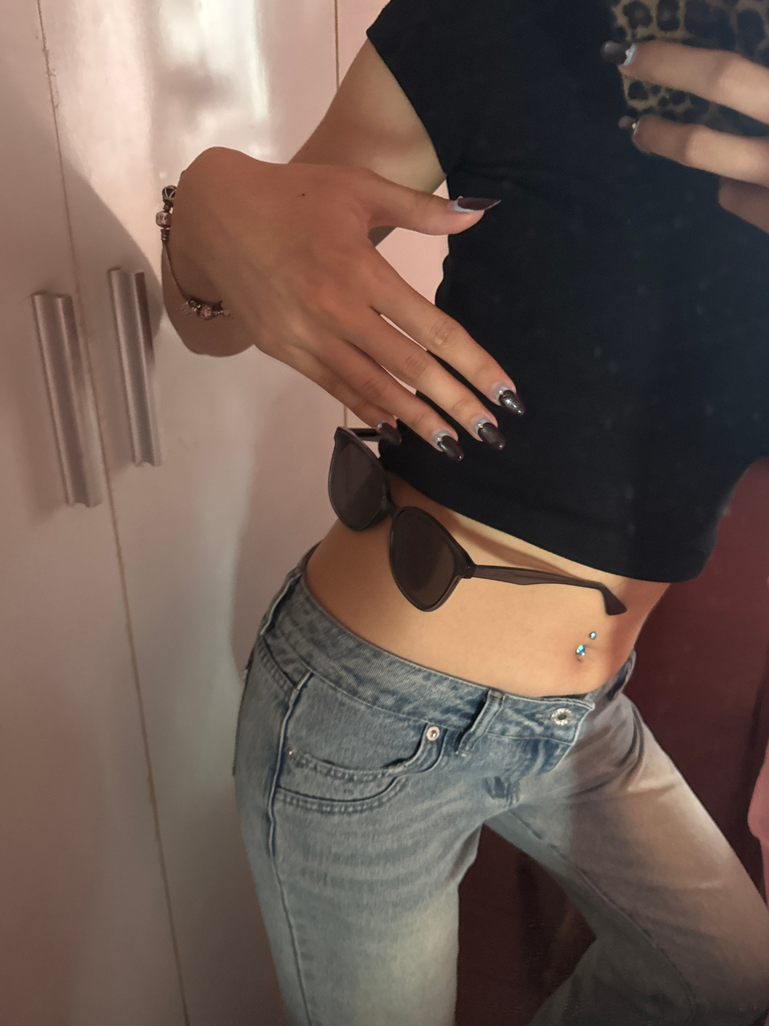 A person lies on a light-colored surface, wearing a black crop top and light blue jeans. The person has a navel piercing, and sunglasses are resting on their abdomen. Their hands are visible, with manβ¦read more