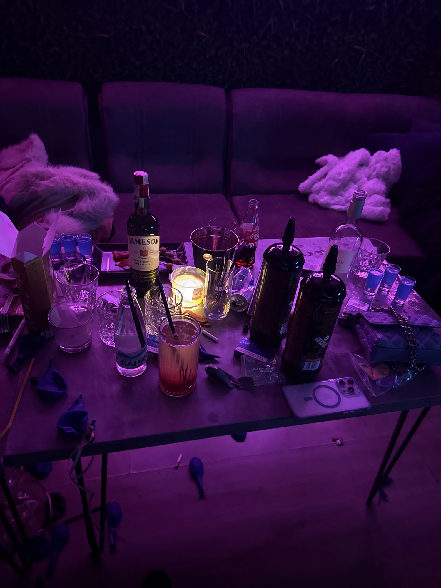 The scene depicts a table covered with various items, including bottles of alcohol (wine and Jameson whiskey), glassware, a mobile phone, a purse, and what appears to be party supplies (balloons, shot…read more