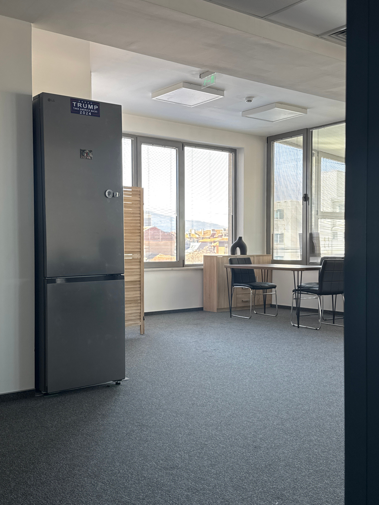 The image depicts an interior view of a modern office space, potentially in Sofia, Bulgaria, as suggested by the urban landscape visible through the windows. The room is characterized by abundant natu…read more