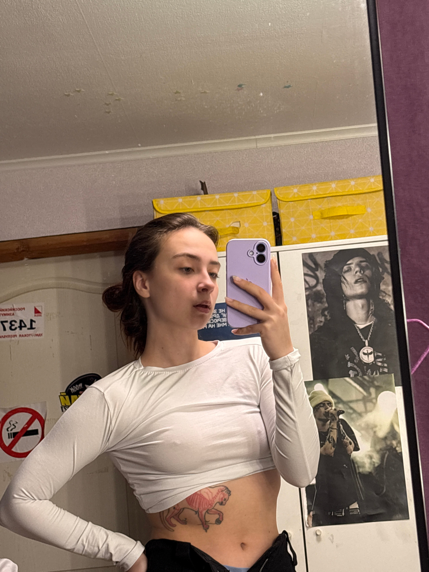 A woman is taking a mirror selfie in an indoor space. She is wearing a white long-sleeved crop top and black bottoms, revealing a tattoo on her stomach. She is holding a purple smartphone. The backgro…read more
