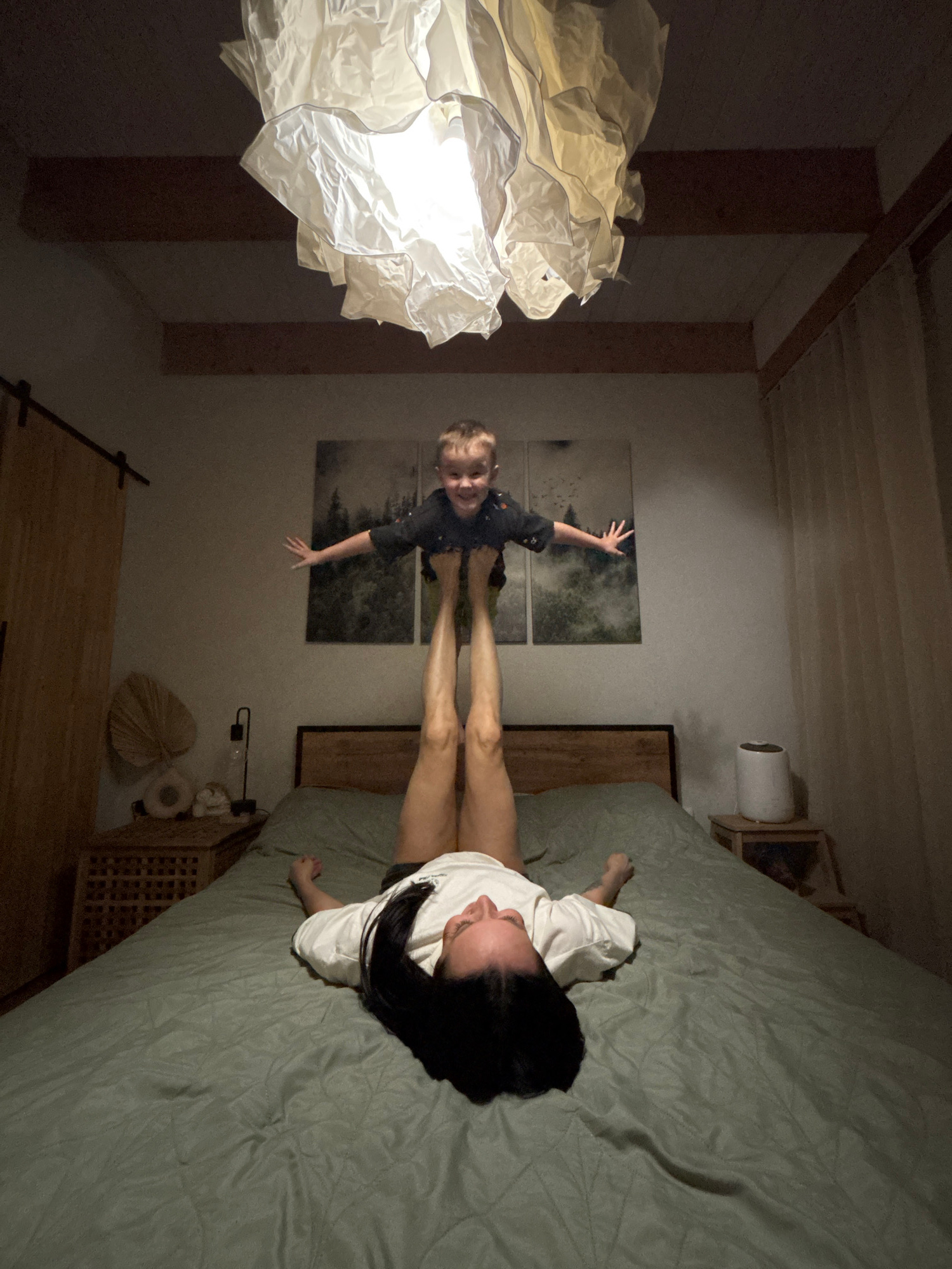 The image shows the interior of a room. A woman with dark hair is lying on a bed covered with a green duvet. Opposite her, in what appears to be a vertical reflection or adjacent image, a child is sta…read more