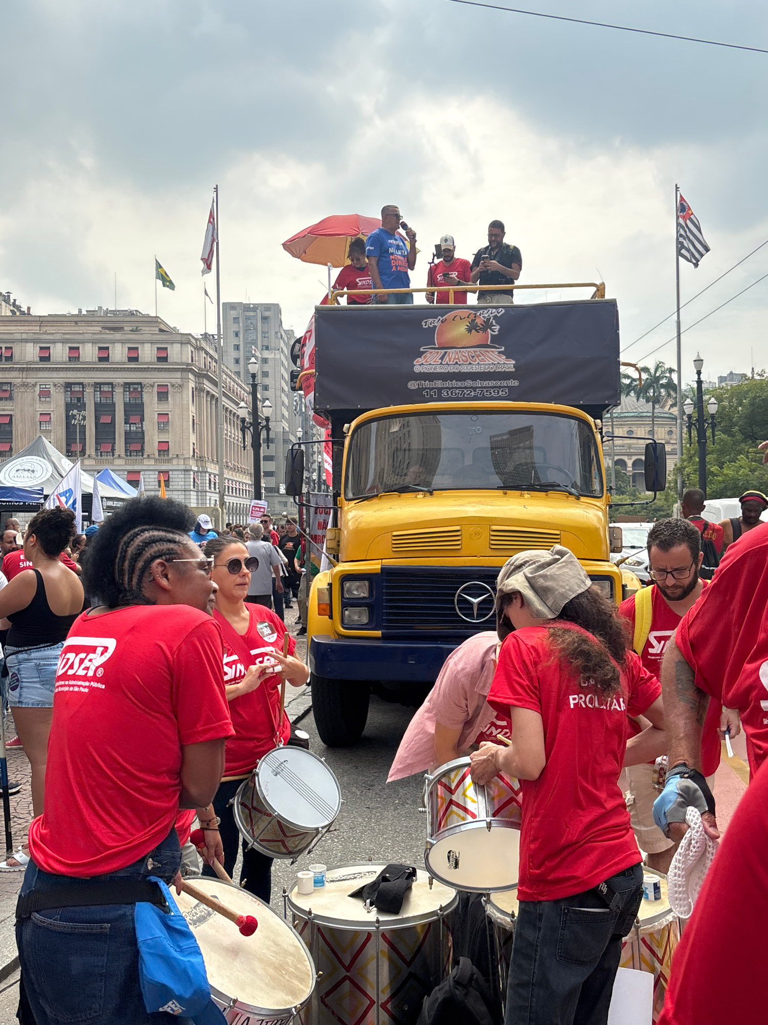 The image captures a vibrant scene in São Paulo, Brazil, featuring a political demonstration or parade. Foreground: A group of people wearing matching red t-shirts are playing drums. Some are activel…read more