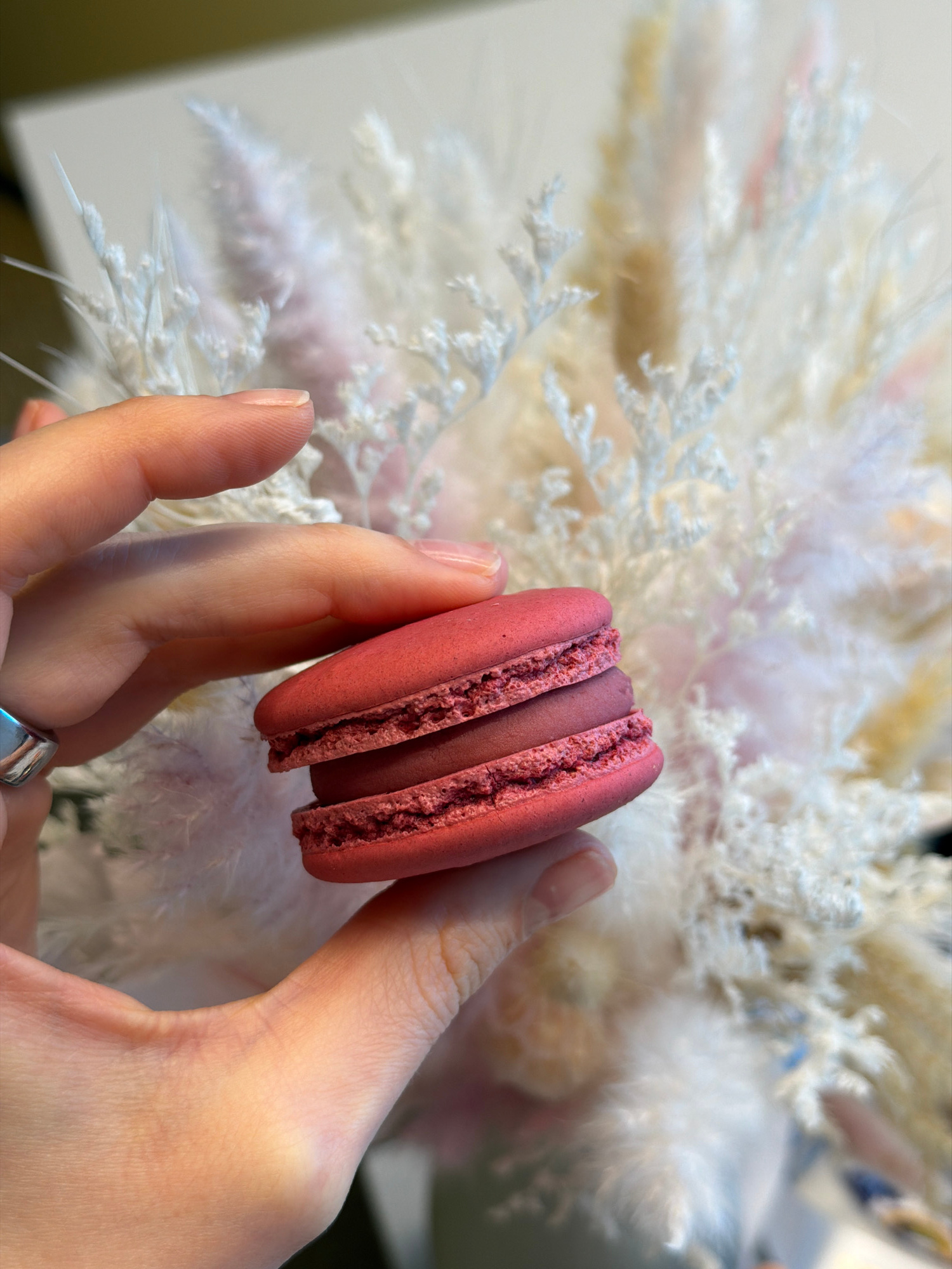 A close-up captures a person's hand holding a red macaron against a background of blurred white and beige floral arrangements. A silver ring adorns the finger closest to the macaron. The scene is well…read more