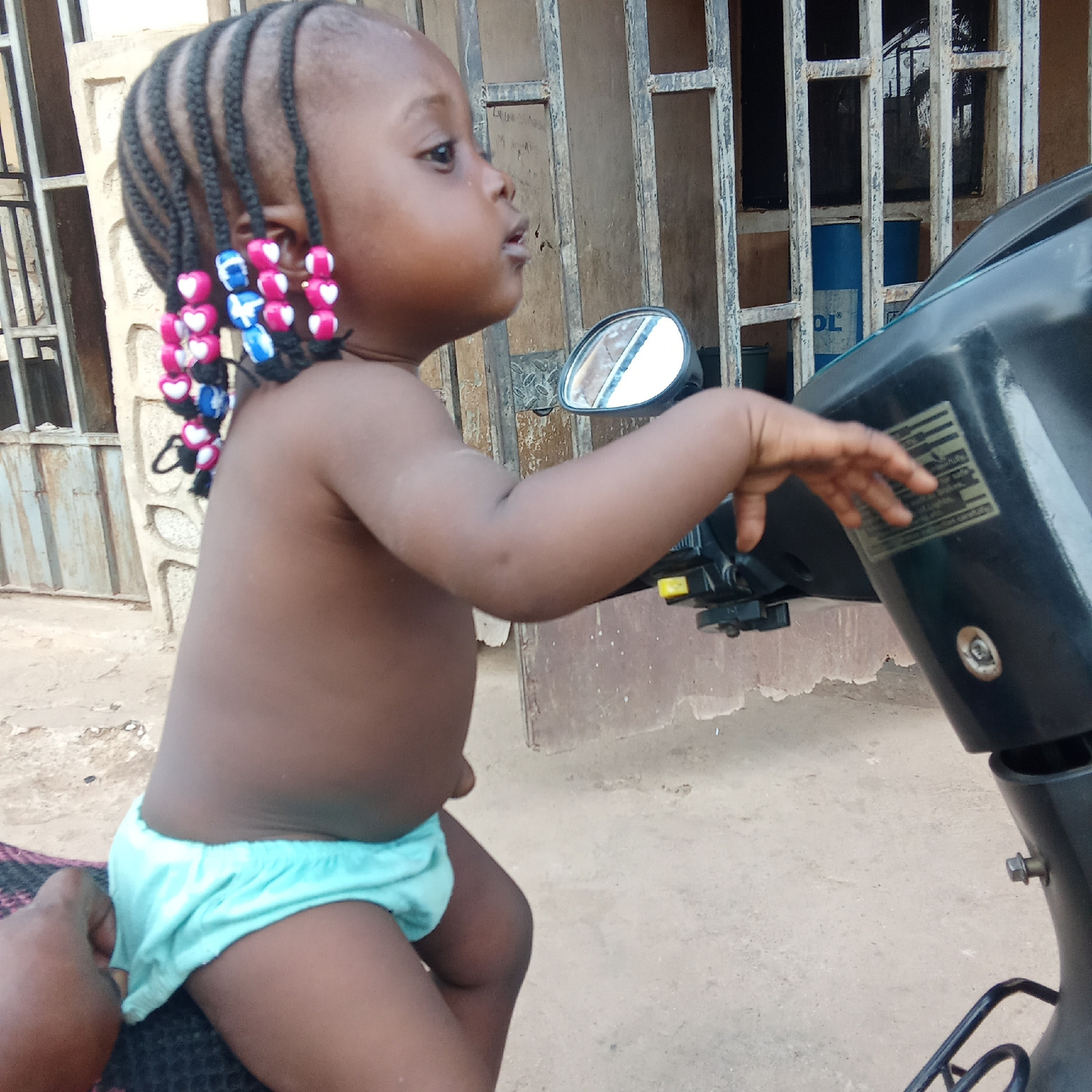This outdoor photograph features a young, dark-skinned child, likely a toddler, seated on or beside a black scooter or motorcycle. The child's hair is styled in multiple short, dark braids, each decor…read more