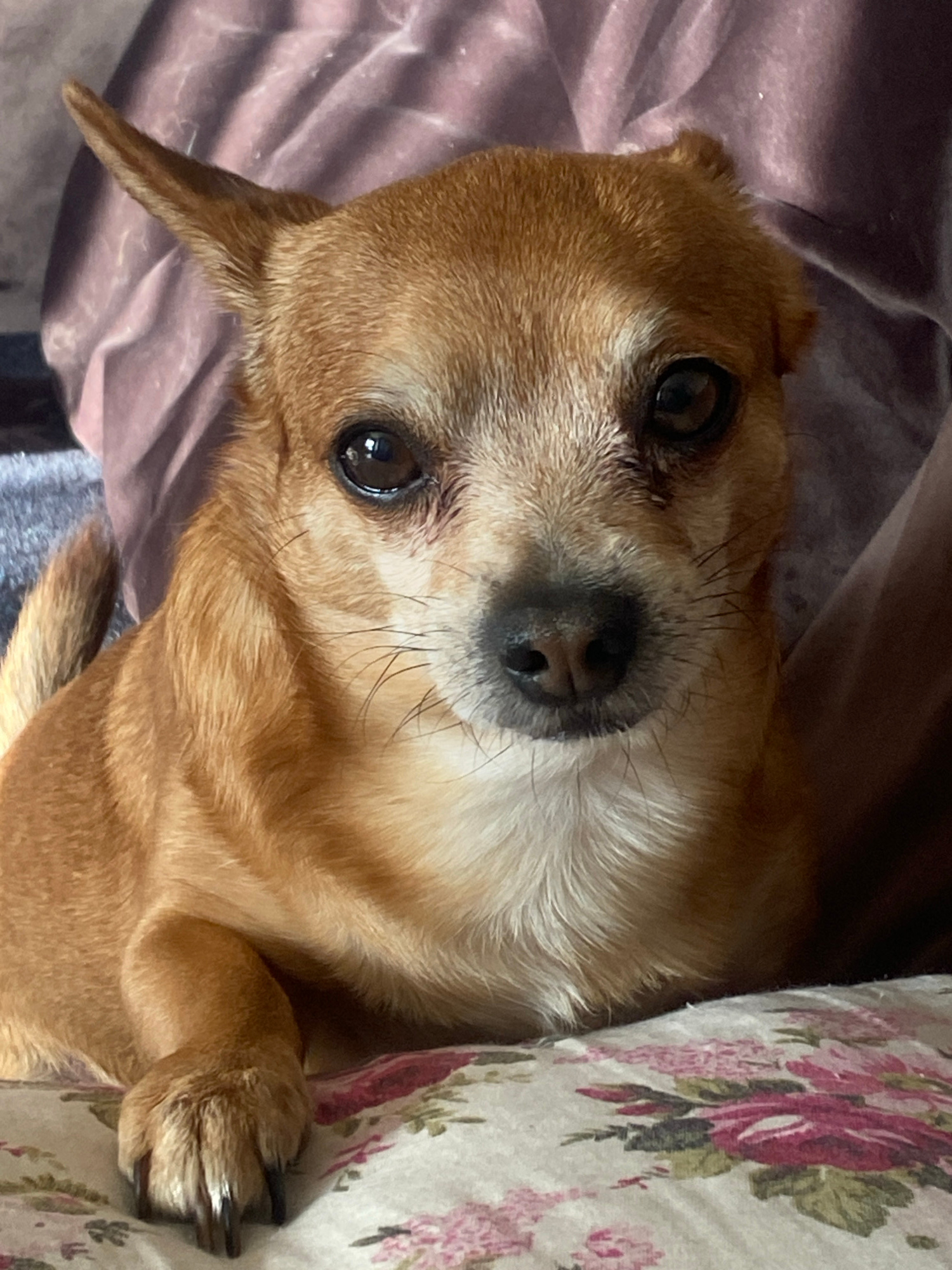 A tan Chihuahua dog lies on its back between two soft surfaces. One surface is a mauve-colored fabric, possibly a blanket or upholstered furniture. The other surface is a floral-patterned fabric, pote…read more