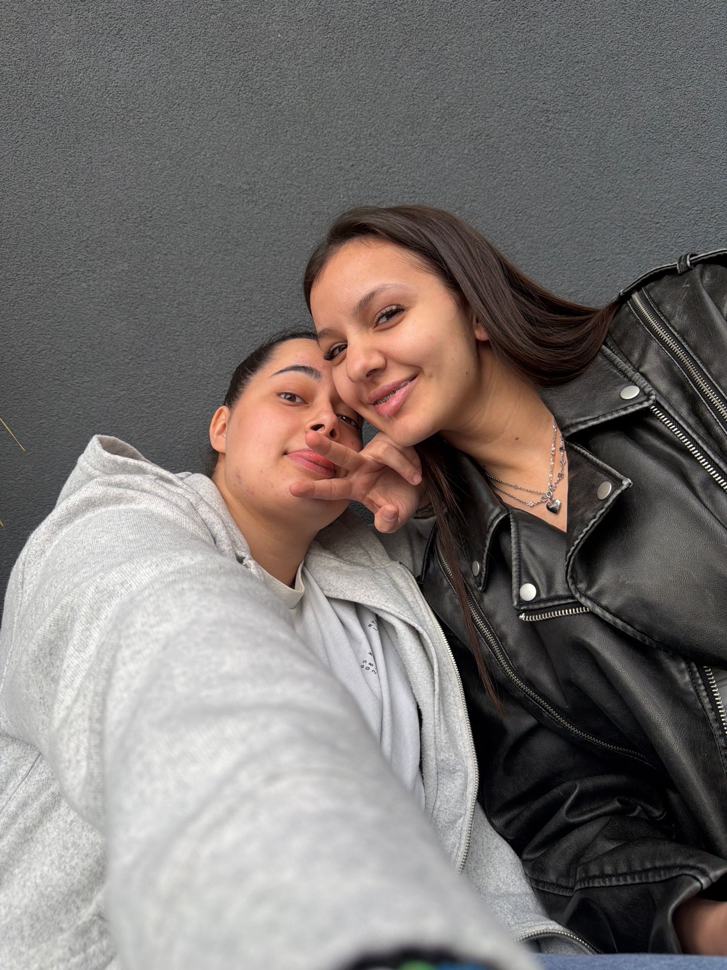 Two young women are captured in a close-up, high-angle shot, lying on a dark grey, textured surface, possibly pavement, in Plovdiv, Bulgaria. The image is rotated, giving a dynamic perspective. The w…read more