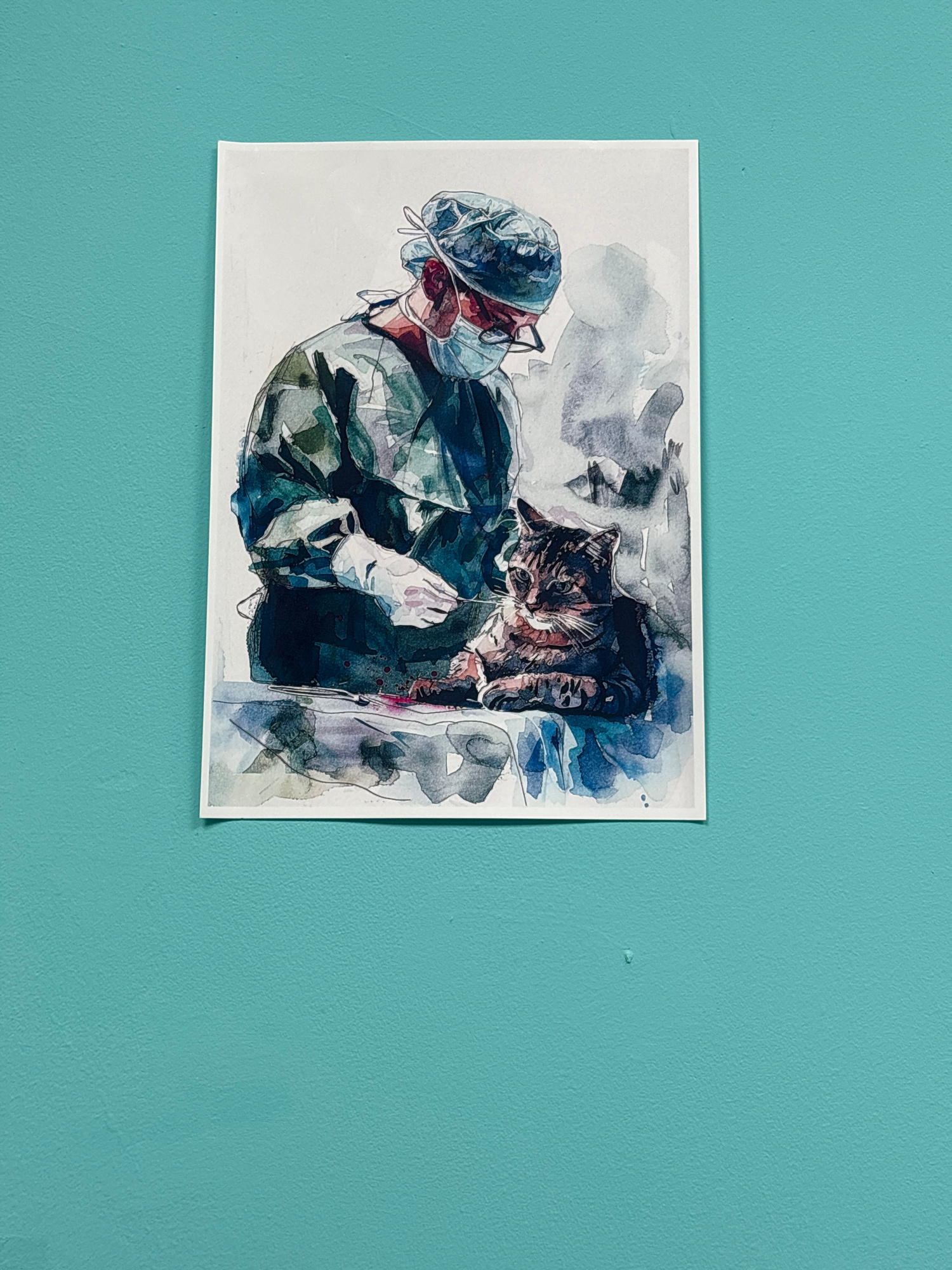 A watercolor painting of a person wearing medical attire holding a cat is hung on a light blue wall. The painting is oriented at a slight angle. The wall appears to be lightly textured. The scene is i…read more
