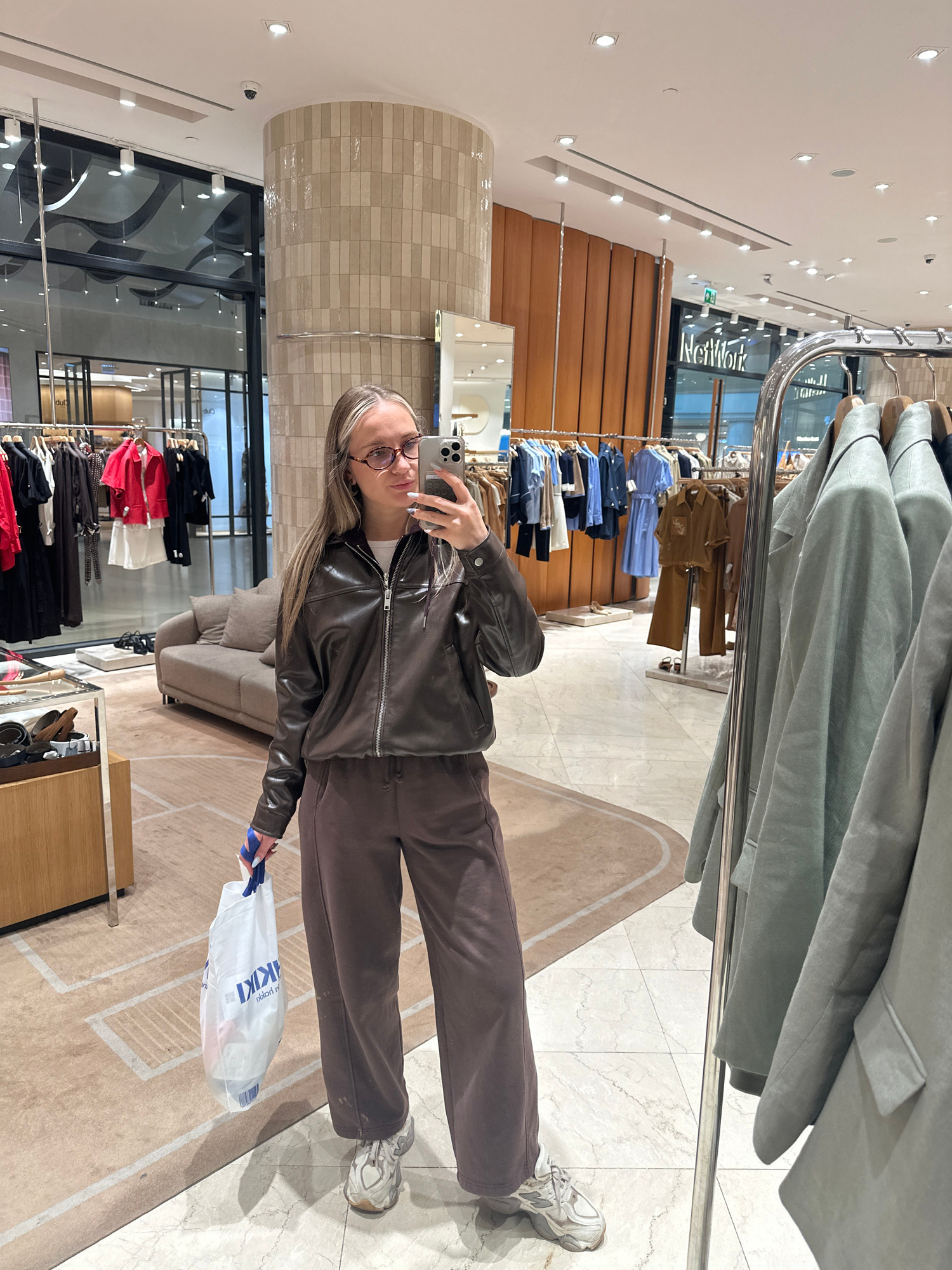 A young woman stands in a clothing store in Esenyurt, Turkey, taking a selfie. She is wearing glasses, a dark brown leather jacket, and matching brown sweatpants. She holds a white plastic shopping ba…read more