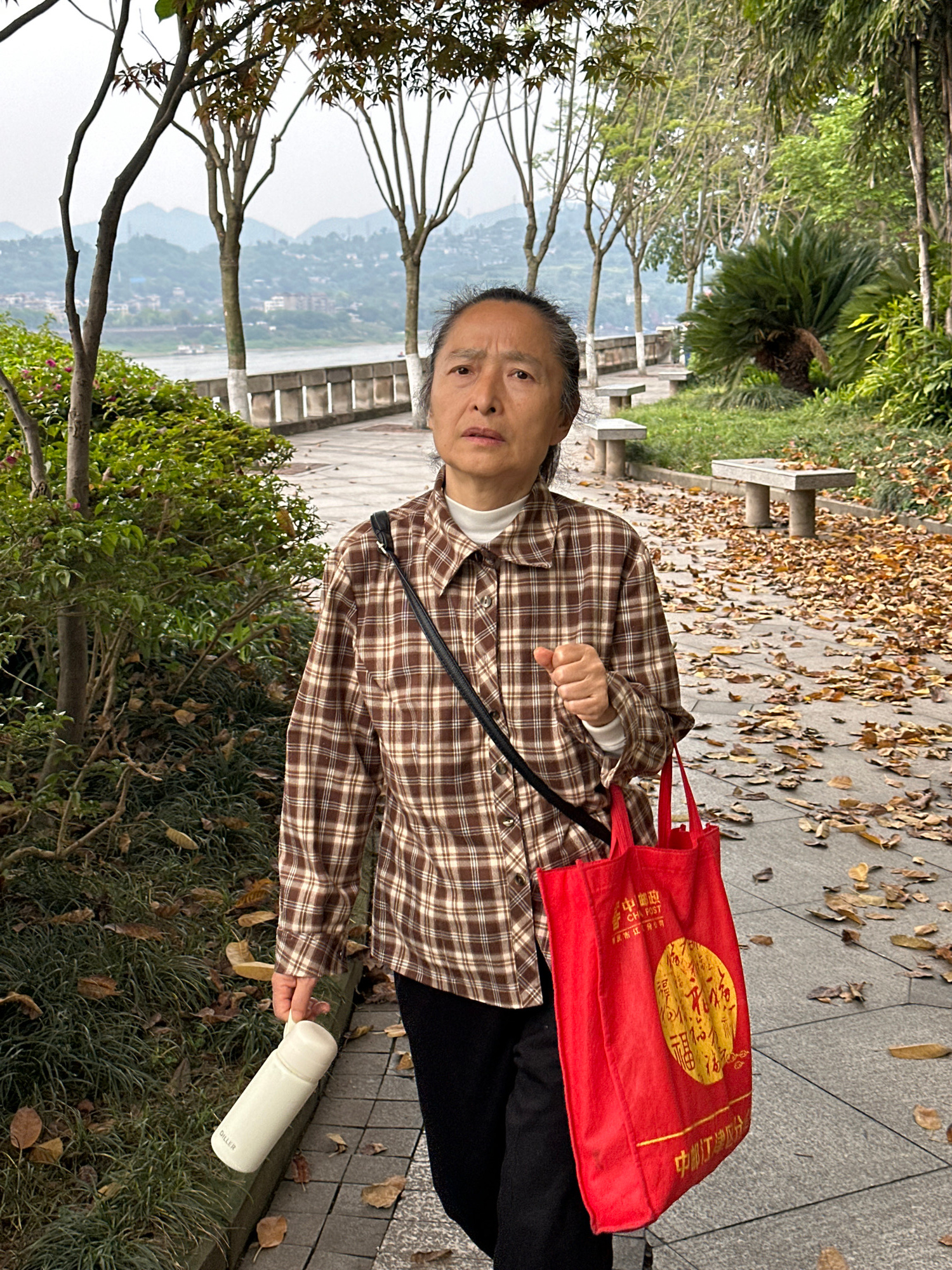 A woman stands on a paved path lined with fallen leaves and green bushes in the city of Jiangjin, China. She wears a brown and white plaid shirt, a white turtleneck, and black pants. She is holding a…read more