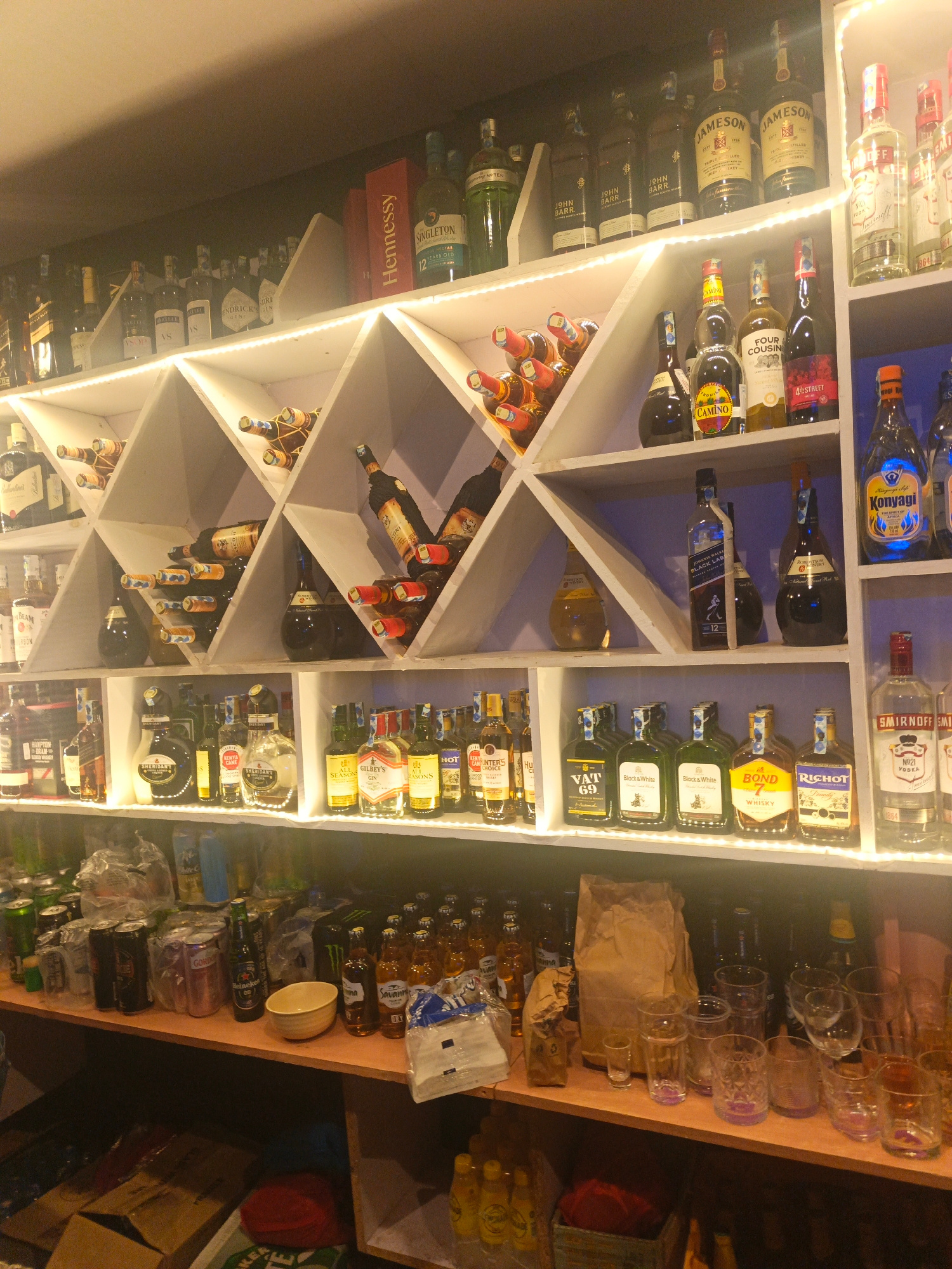 The image shows a well-stocked liquor cabinet, likely in a bar or restaurant, in Nairobi, Kenya. The shelves are filled with a variety of alcoholic beverages, including whiskey (Jameson, John Barr, Jo…read more