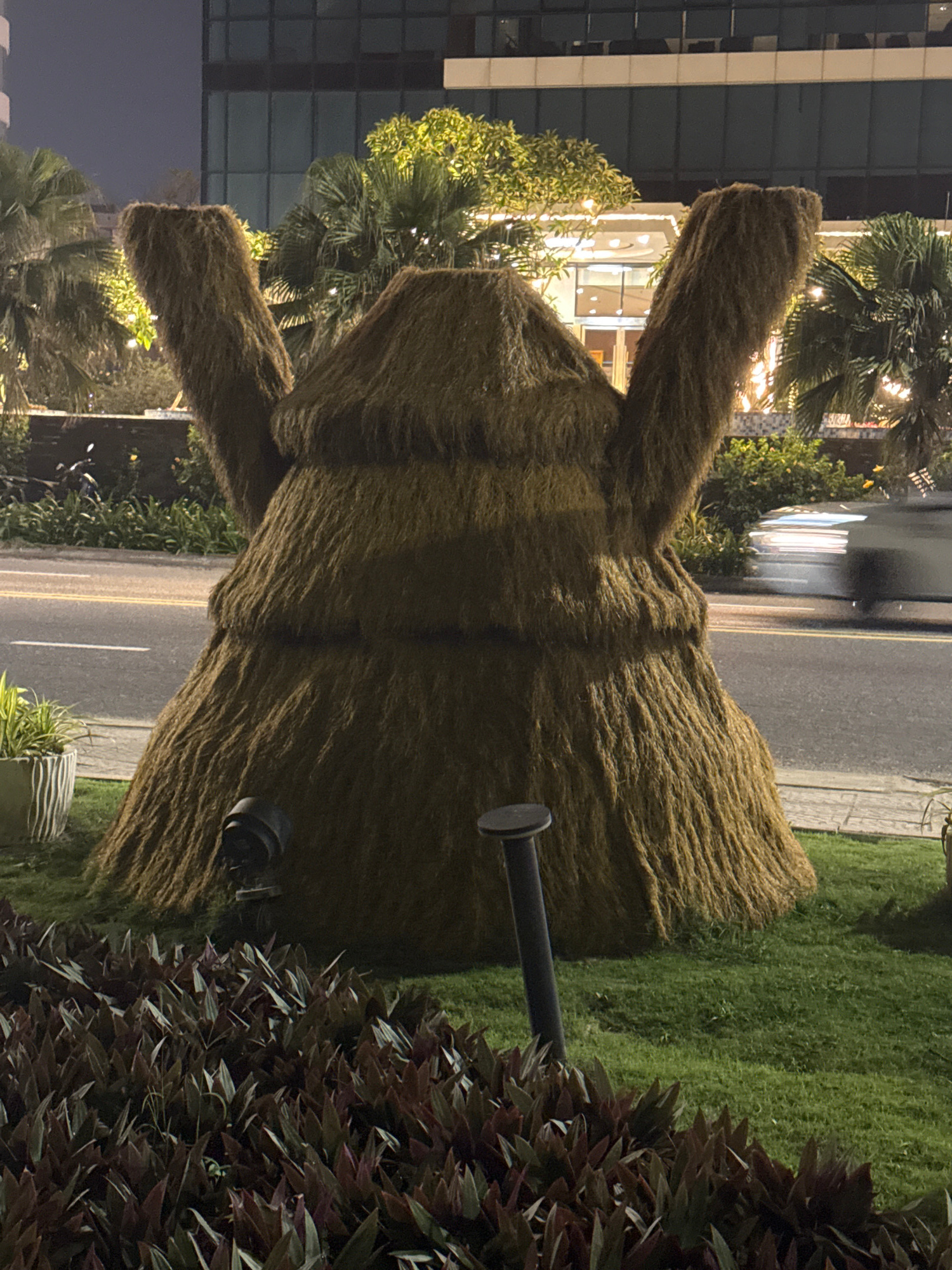 The image shows a large, brown, topiary rabbit sculpture next to a city street at night. The sculpture is made of a coarse material resembling tightly packed straw or rough fiber. Its long ears extend…read more
