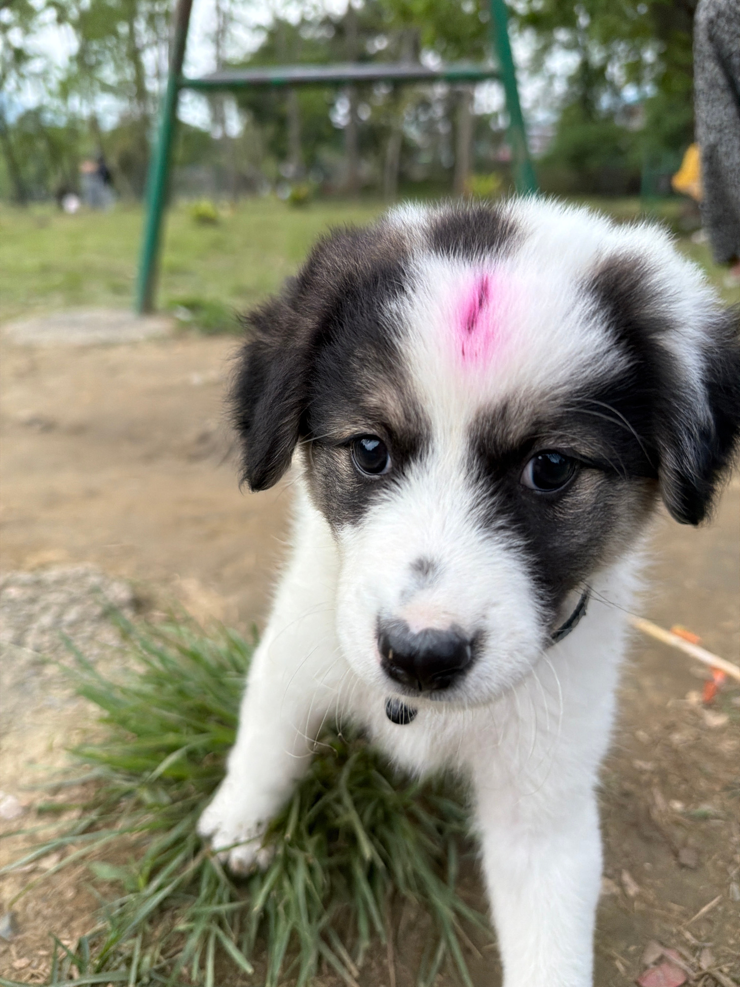 A close-up, low-angle image captures a small, parti-colored puppy in an outdoor park setting in Pokhara, Nepal. The puppy exhibits predominantly white fur with prominent black patches around its eyes…read more