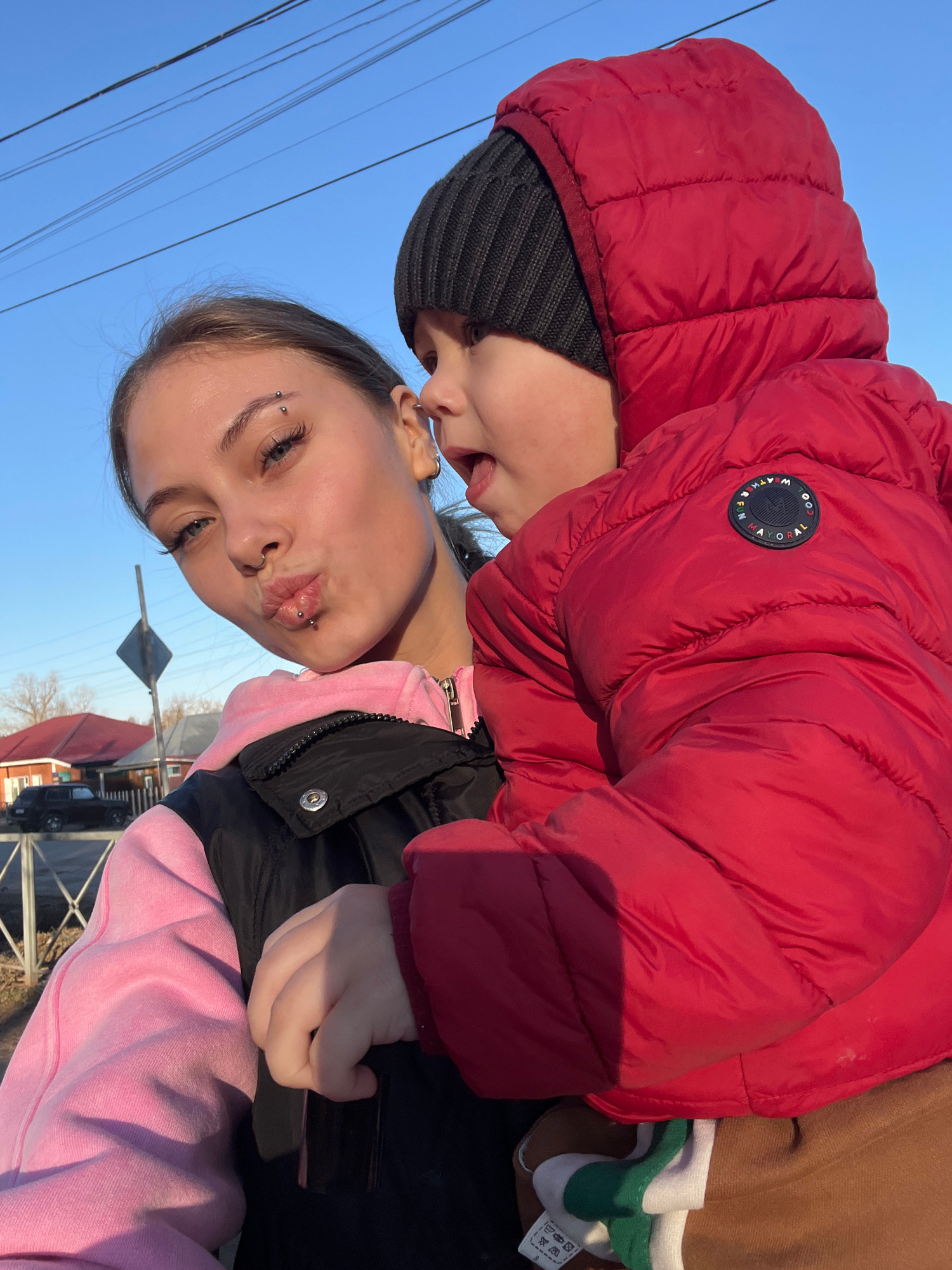 An outdoor, eye-level photograph, rotated 90 degrees clockwise, captures two individuals against a clear blue sky. The scene is set in what appears to be a street or residential area, indicated by dis…read more