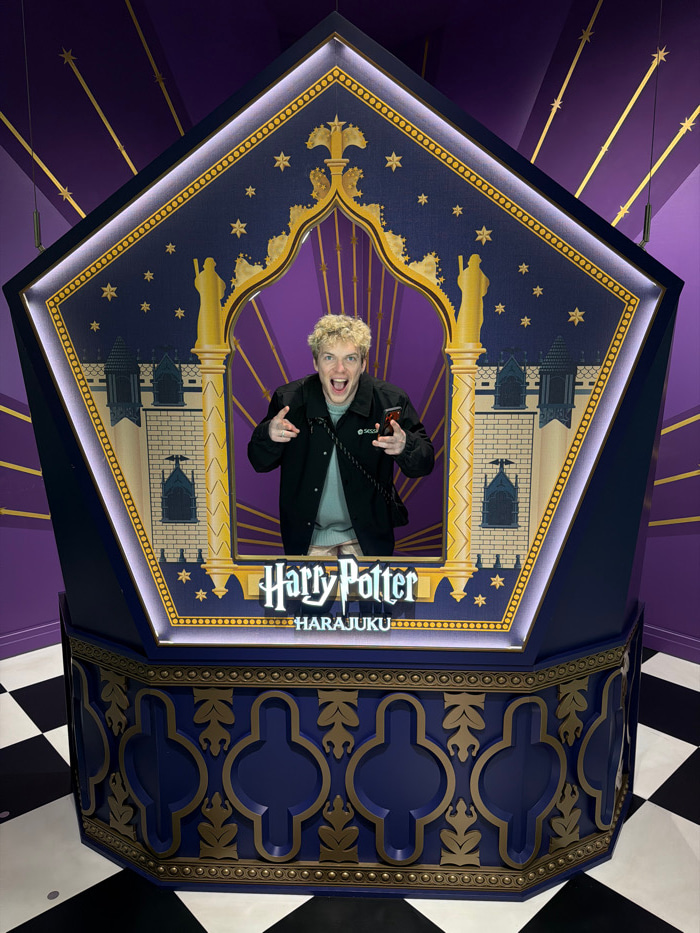 A young adult male with short, curly blonde hair is positioned within a large, pentagonal Harry Potter-themed photo display. He is smiling widely with an open mouth and looking directly forward, exten…read more