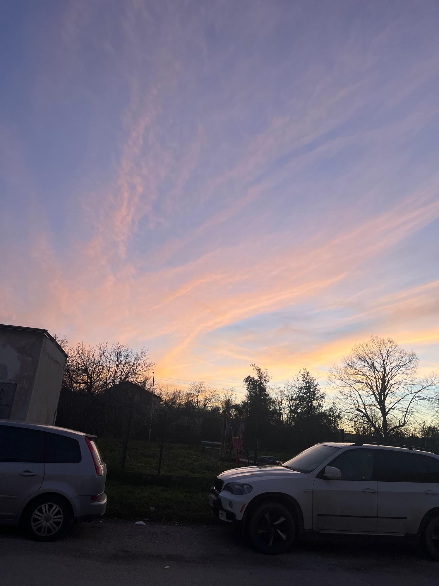 The image shows a twilight scene in an urban area, likely in Lovech, Bulgaria, based on contextual information. The sky is a mix of pale blue and pink hues, with streaks of orange near the horizon. Si…read more