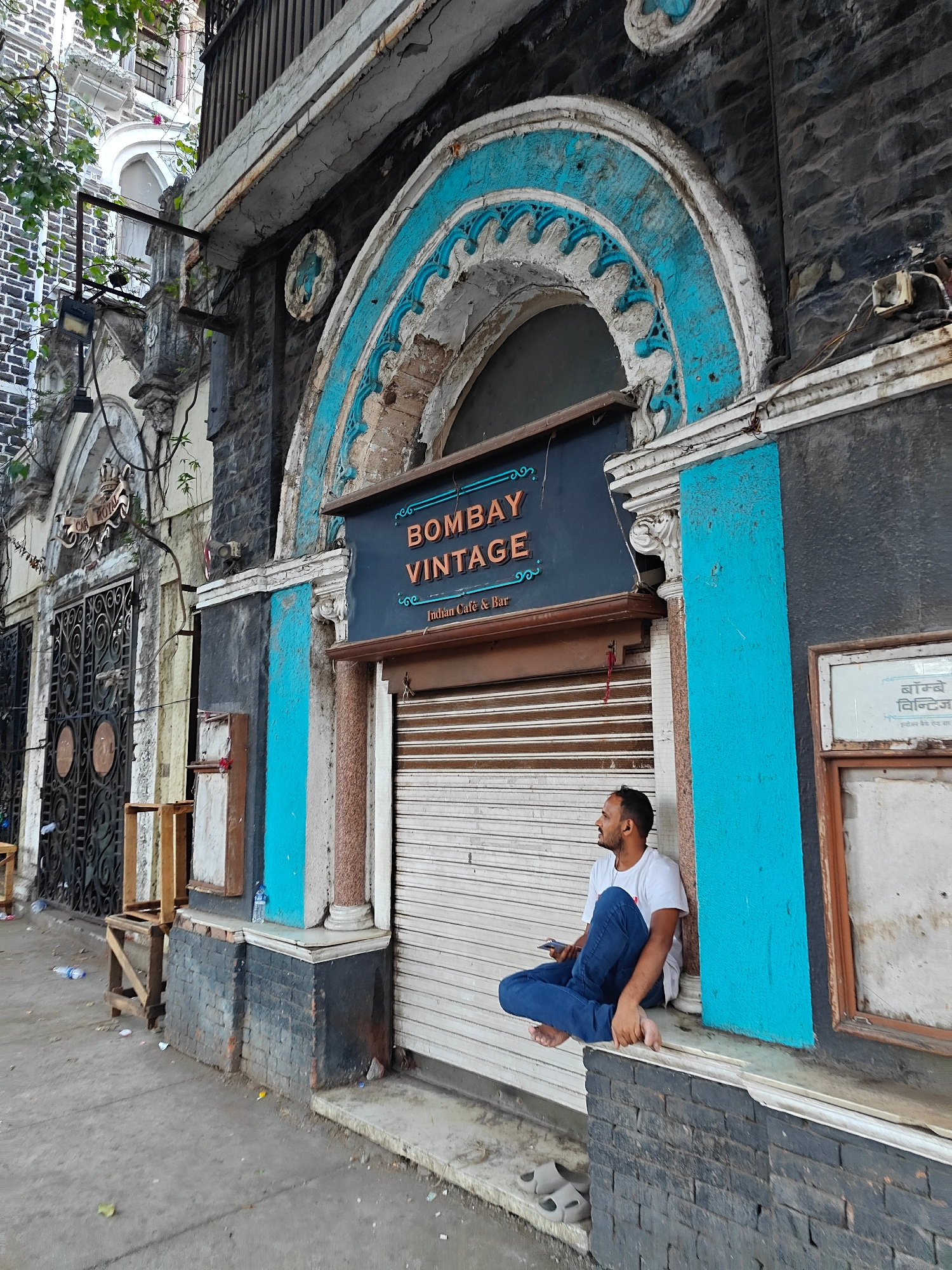 A man sits on a ledge outside a building in Mumbai, India. The building, "Bombay Vintage Indian Cafe & Bar", has an aged facade with cracked plaster and peeling paint in shades of blue, white, and bro…read more