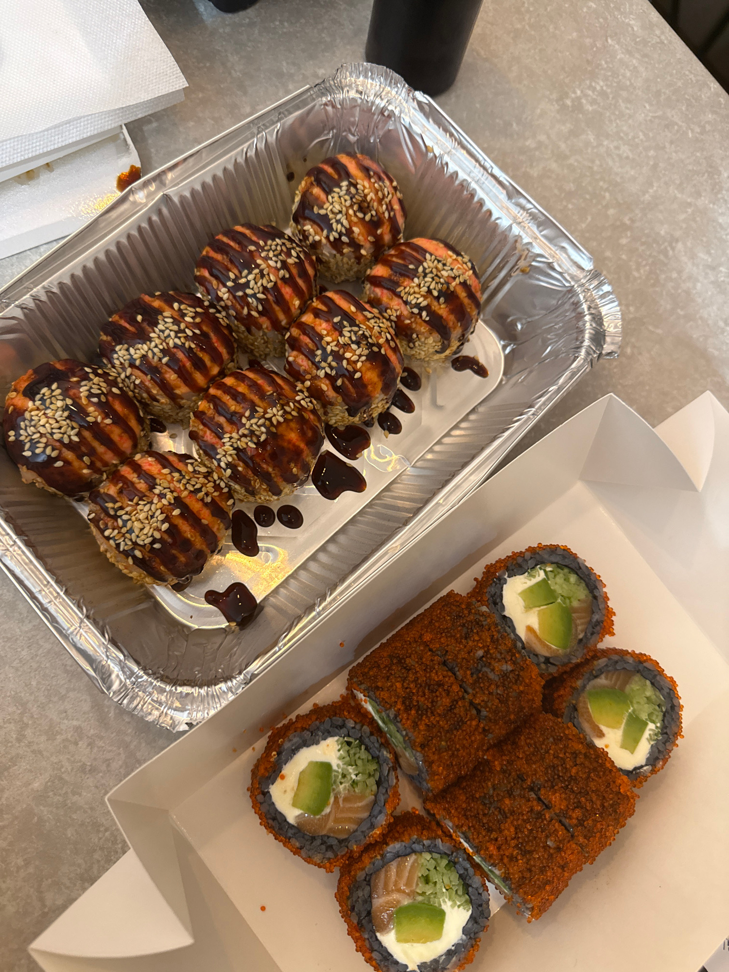 The image depicts two containers of sushi on a gray surface. The container on the left is a silver aluminum tray holding a dozen sushi rolls arranged in a triangular formation. These rolls are topped…read more