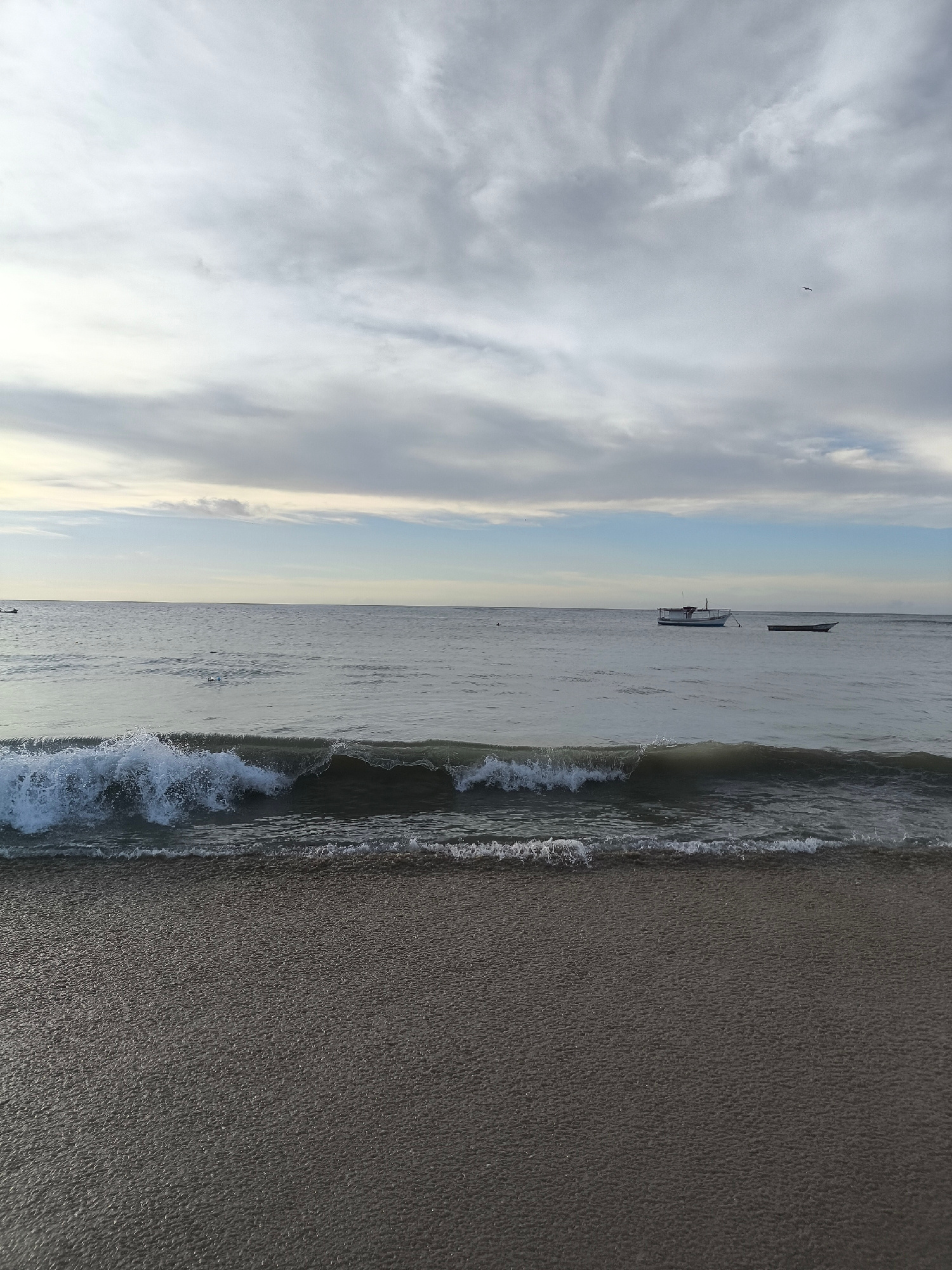 The image depicts a tranquil coastal scene in Pedro González, Venezuela. The foreground consists of a sandy beach with a wave breaking along the shoreline. The sea stretches towards the horizon, where…read more