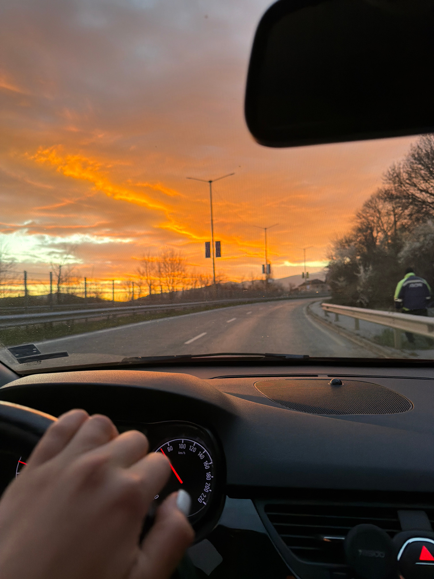 The photograph is taken from inside a car on a road at sunset or sunrise. The sky is a blend of yellow and orange. Roadside infrastructure like guardrails and lamp posts are visible. The car's dashboa…read more