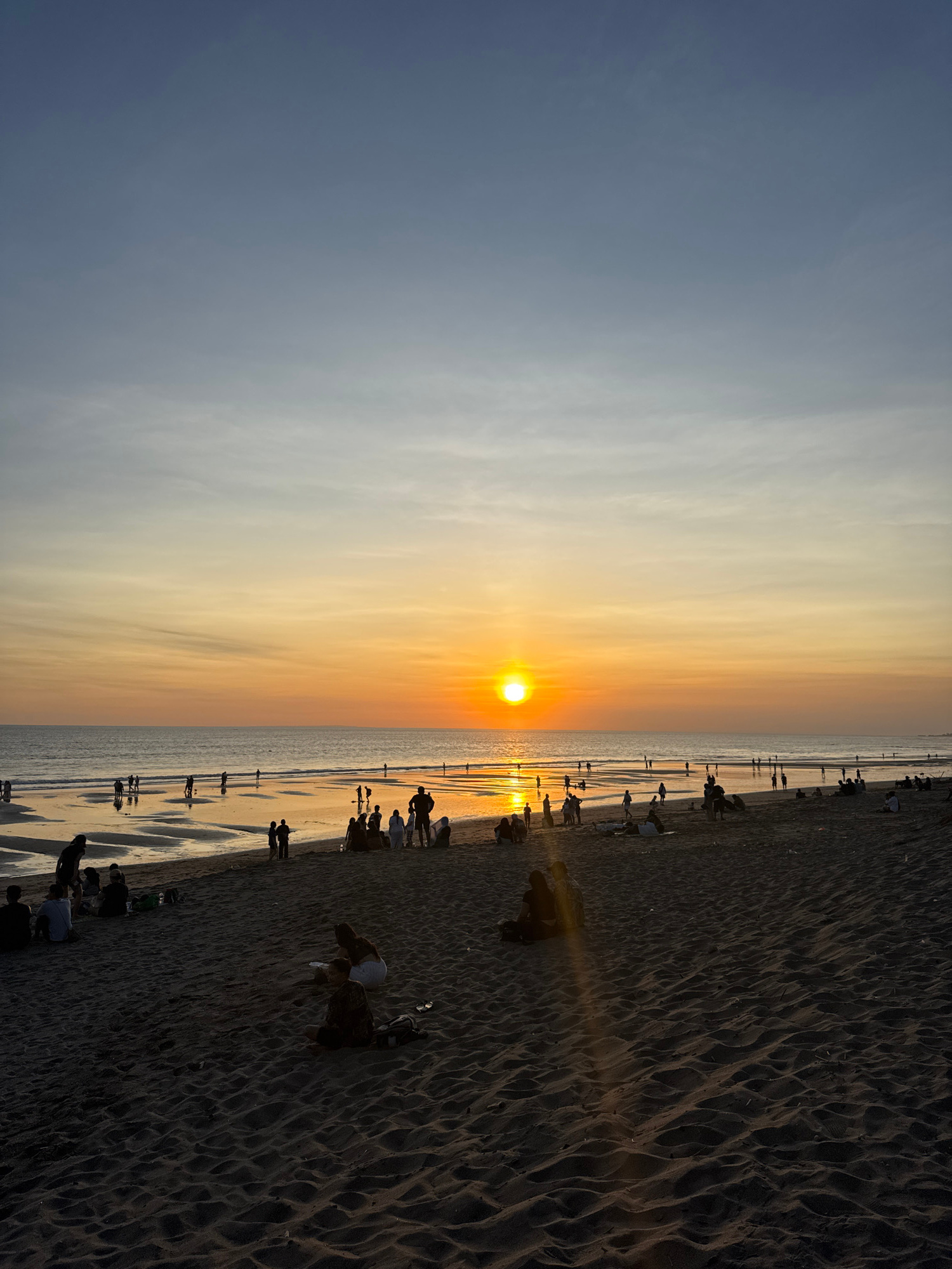 Captured at sunset in North Kuta, Indonesia, the image depicts a crowded beach. People are scattered along the shoreline, some walking, others sitting or standing near the water. The setting sun casts…read more