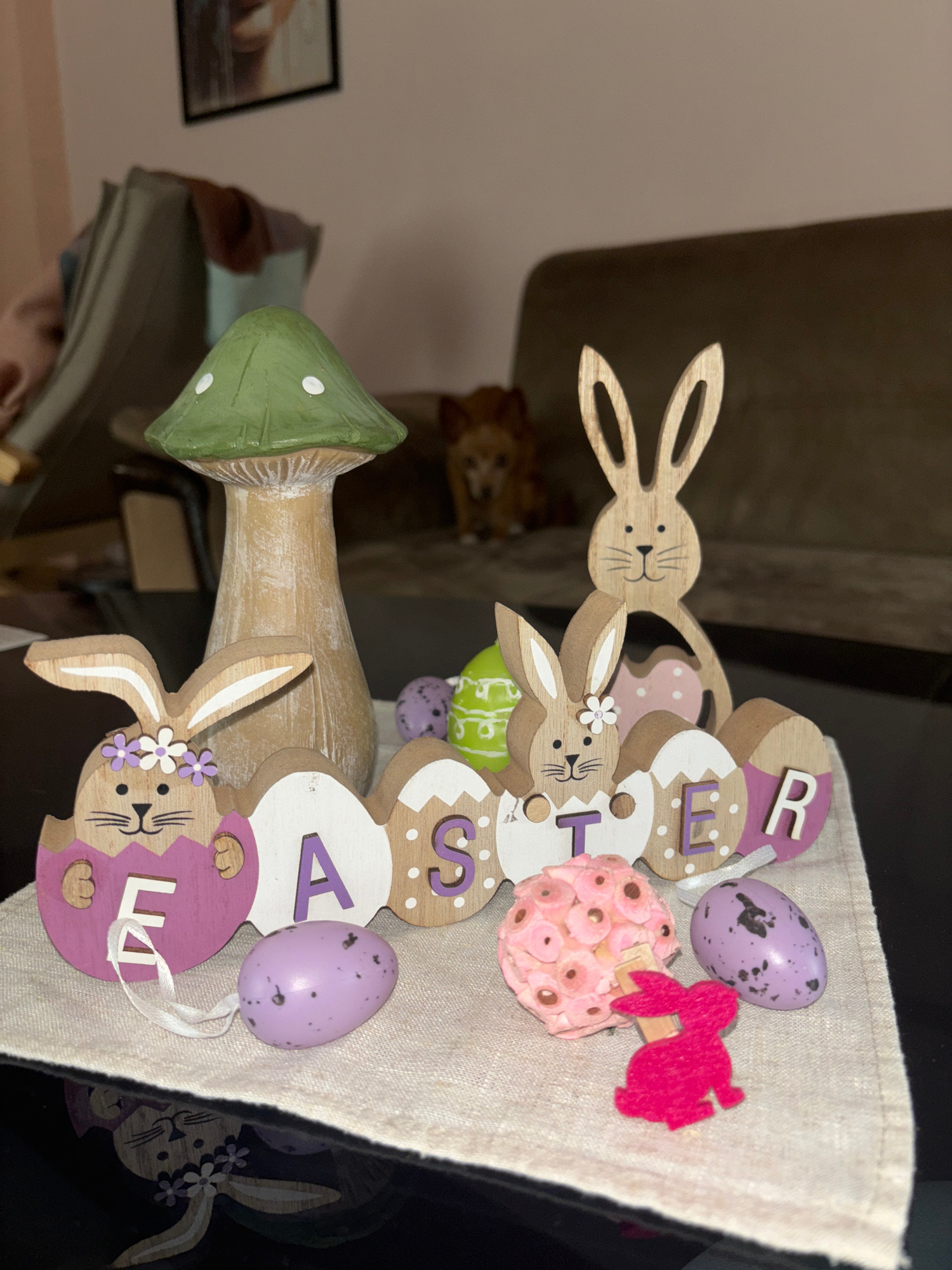 Here is a description of the image: The image shows an Easter decoration resting on a light-colored surface, possibly a linen tablecloth. The decoration consists of a wooden mushroom base with a gree…read more