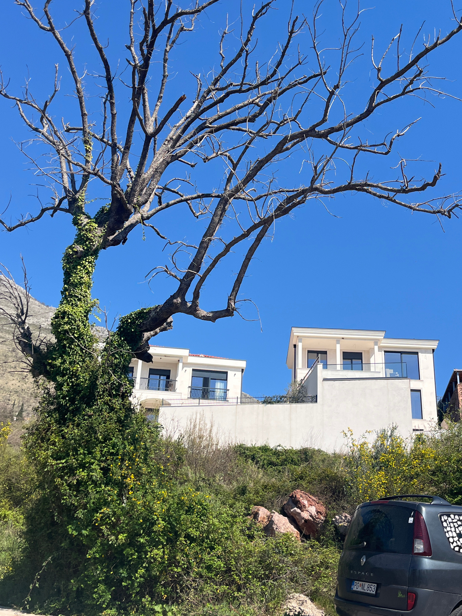 The image depicts a sunny day in Pržno, Montenegro, focusing on a tree with bare branches and green vines growing on it, set against a clear blue sky. A modern, white multi-story building sits on a ri…read more