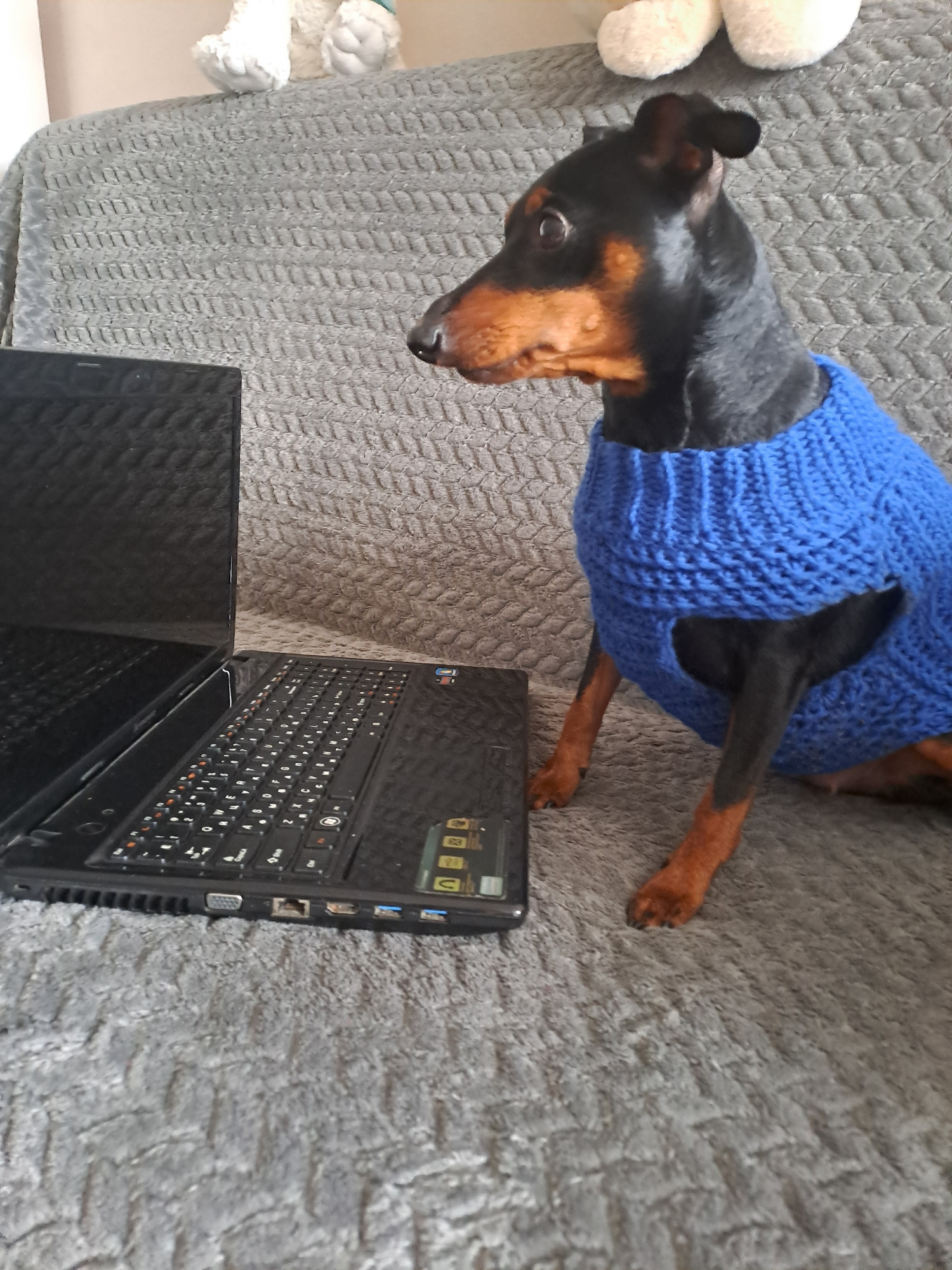 A black and tan doberman pinscher wearing a blue knit sweater lies on a gray textured surface (possibly a couch) next to a black laptop computer. A white stuffed animal sits to the left of the dog, po…read more