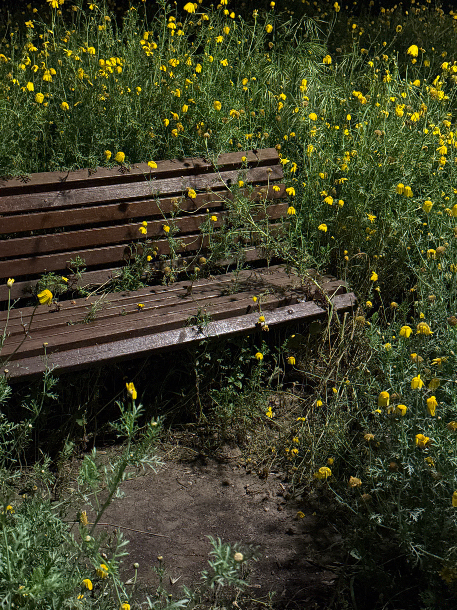 Captured at night, the image depicts a park bench nestled amongst vibrant yellow flowers in Tel-Aviv, Israel. The weathered wooden bench is partially obscured by the flora, which also extends towards…read more