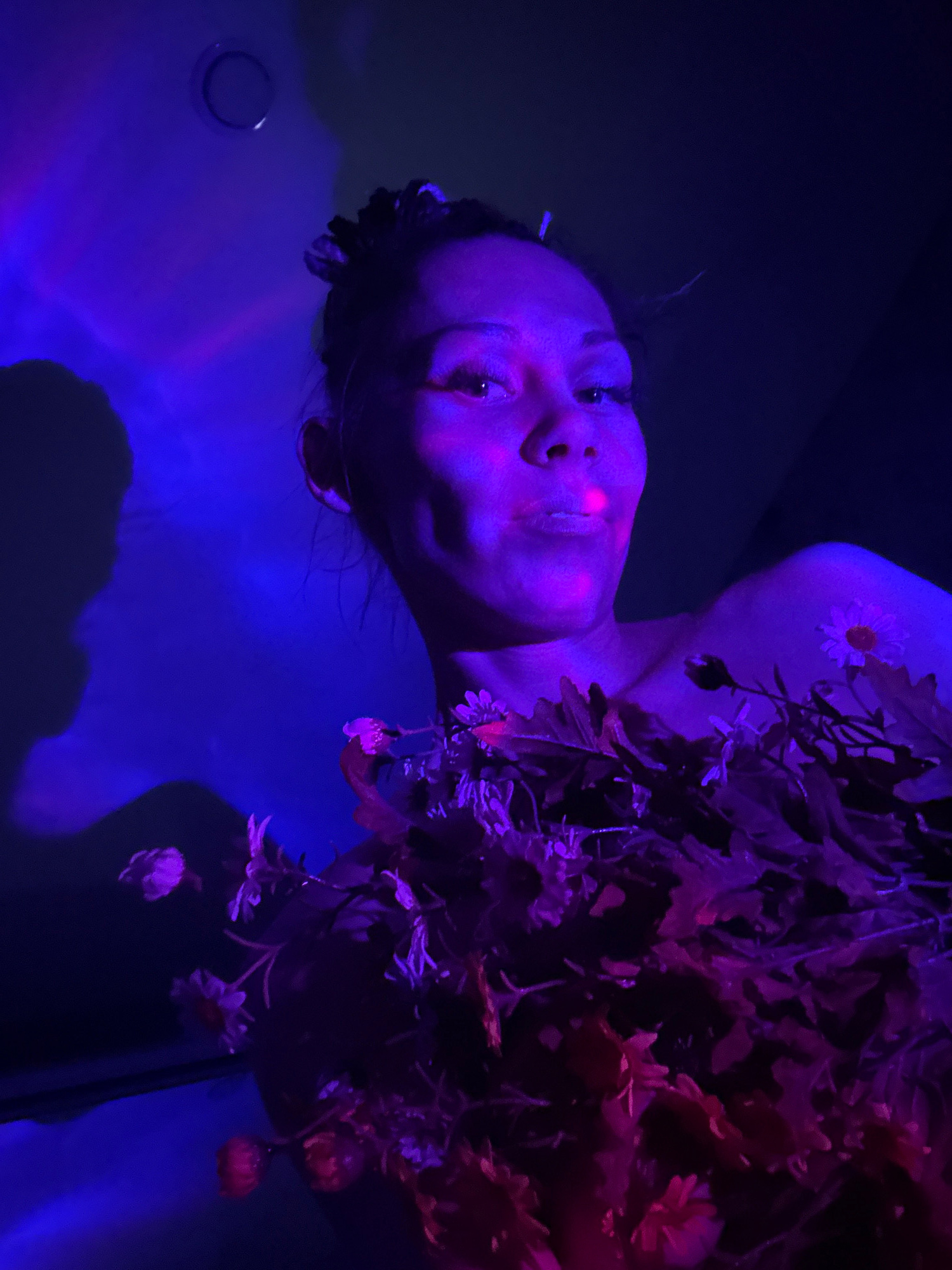 A person lies in a bathtub filled with water, photographed from above in a dimly lit room, likely in Rusanovo, Russia. The lighting casts a blue hue across the scene, with hints of purple and red arouβ¦read more