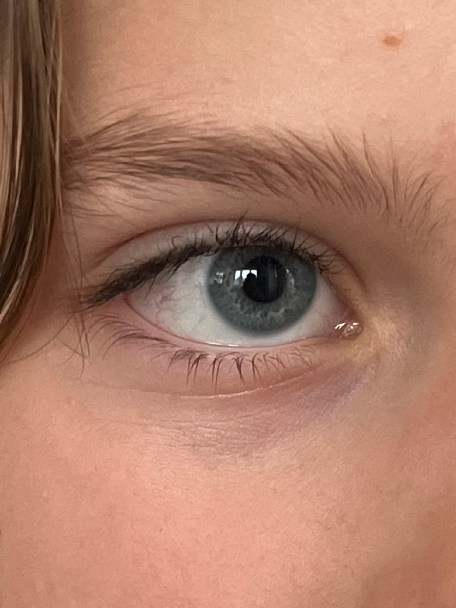 A close-up photograph depicts a human eye, light blue with a dark pupil reflecting light. The eye is surrounded by fair skin, eyelashes, and eyebrow hairs. A mole is visible above the eyebrow. The botβ¦read more