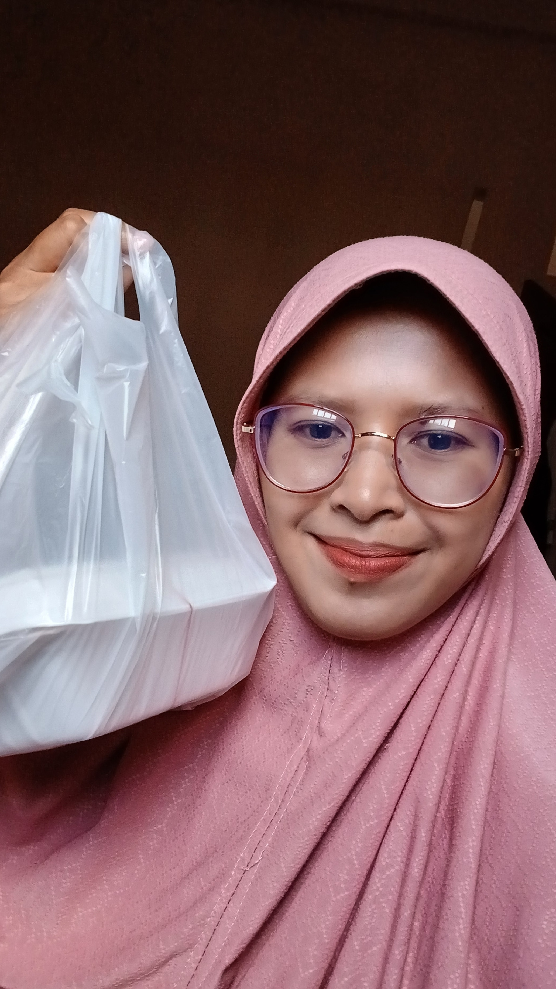 A woman wearing a pink hijab and glasses smiles at the camera while holding a white plastic bag. The background is a dark, solid color. The location is suggested to be Lhokseumawe, Indonesia, but thisβ¦read more