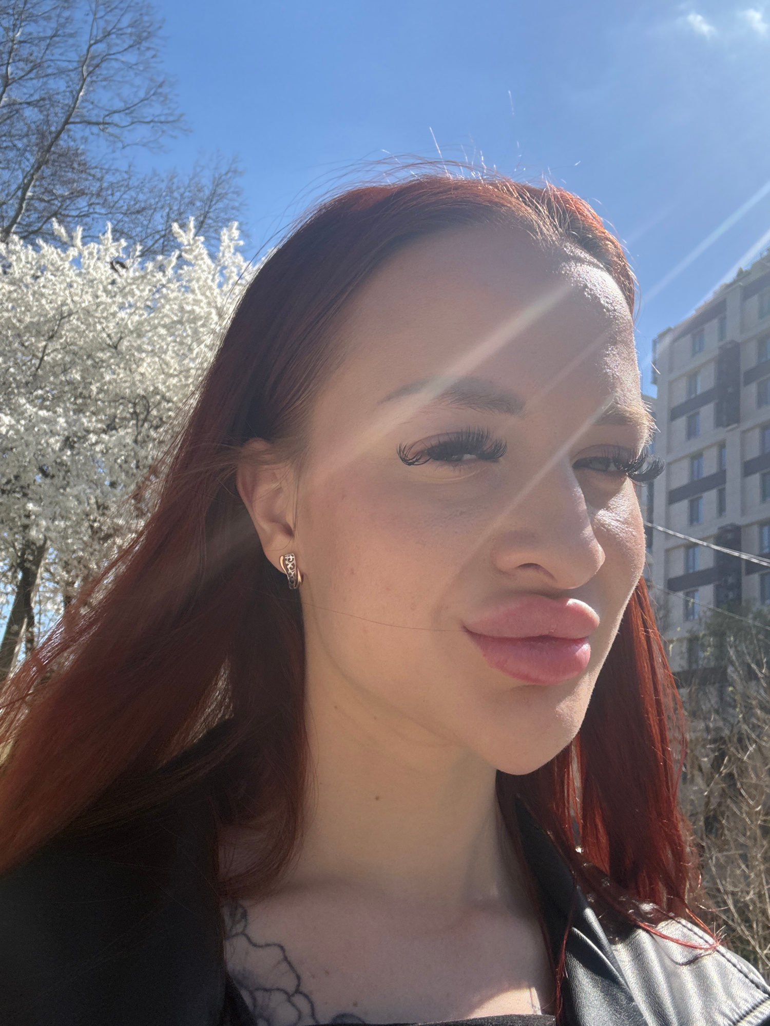 A selfie of a woman with auburn hair, pursed lips, and prominent eyelashes, taken outdoors on a sunny day. The sky is bright blue, and a building is visible in the background. A flowering tree with wh…read more