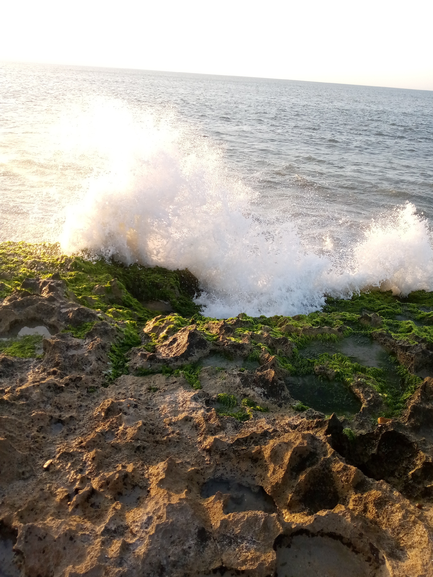 The image shows a rocky shoreline in Juan Griego, Venezuela, with waves crashing against the rocks. The rocks are covered in patches of green algae. The sea stretches to the horizon, with the sky appe…read more