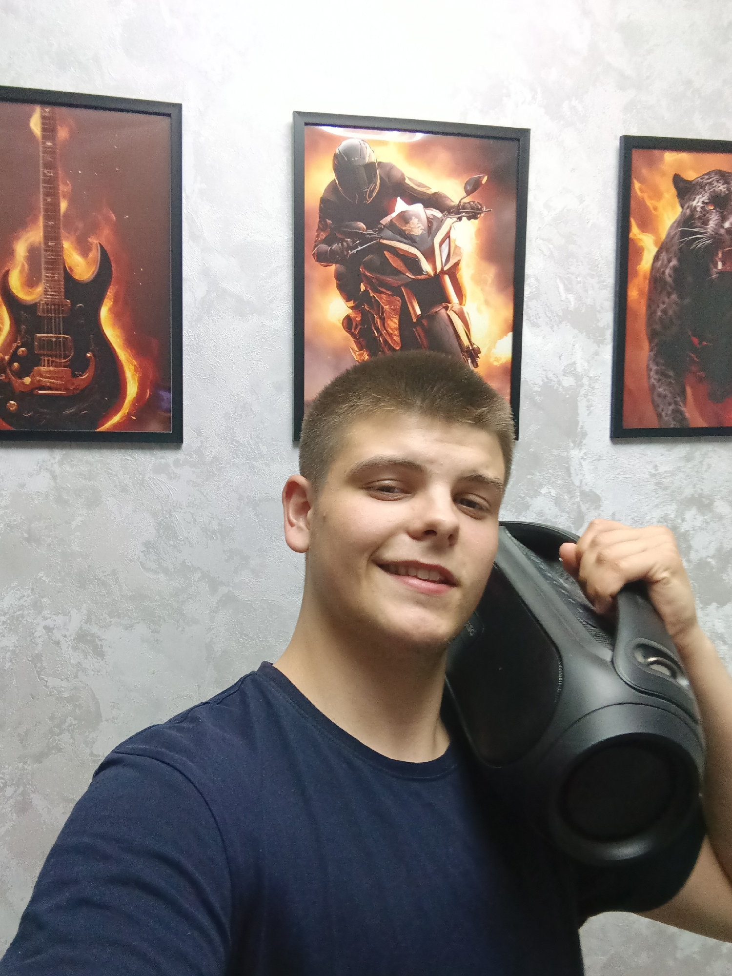 A young man with short, light-brown hair is smiling and holding a black boombox on his left shoulder. He is wearing a dark blue T-shirt. Three framed pictures hang on the wall behind him: one of an el…read more
