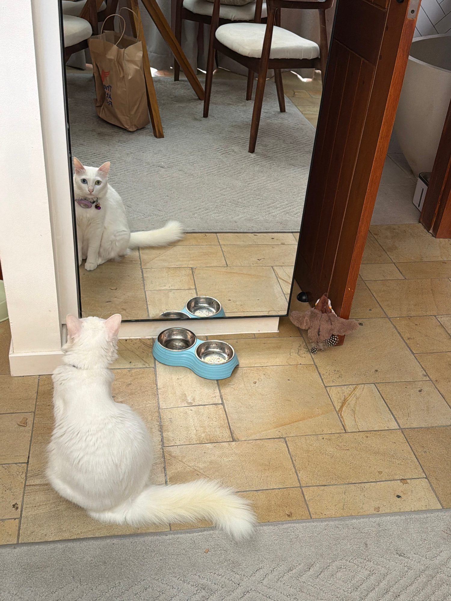 A high-angle indoor shot depicts a white cat standing near a blue three-bowl pet feeder. The cat's reflection is visible in a mirror, positioned adjacent to the feeder. A wooden countertop runs above…read more