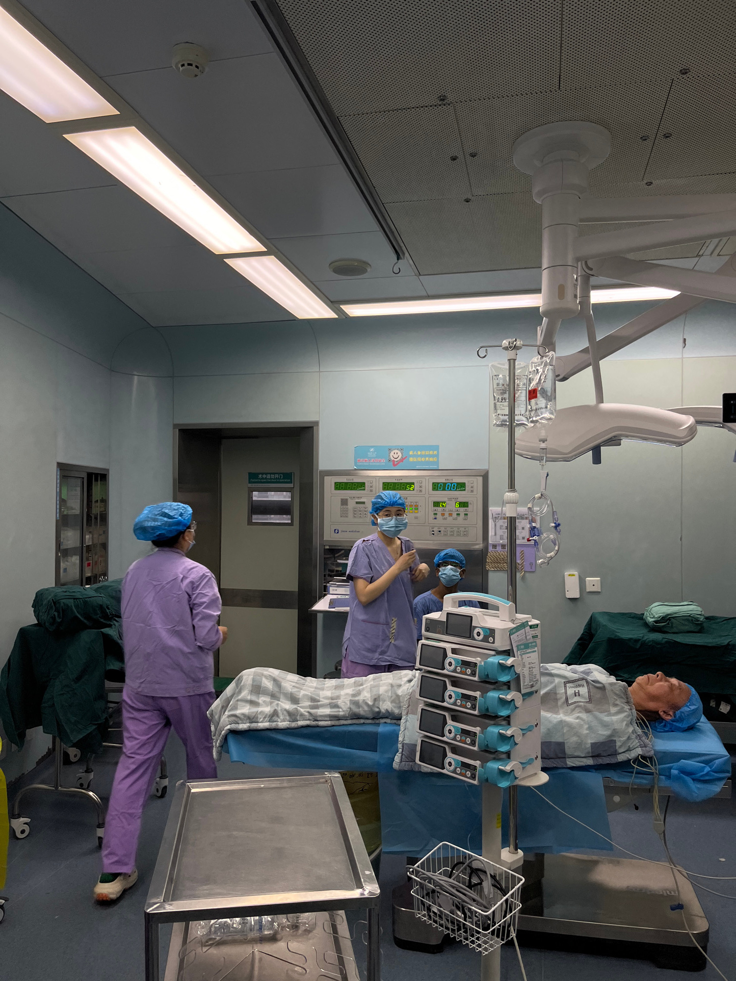 The image depicts an operating room scene, likely located in a hospital within the Yuzhong District of China. Two medical personnel are present, both wearing light purple scrubs, surgical caps, and ma…read more