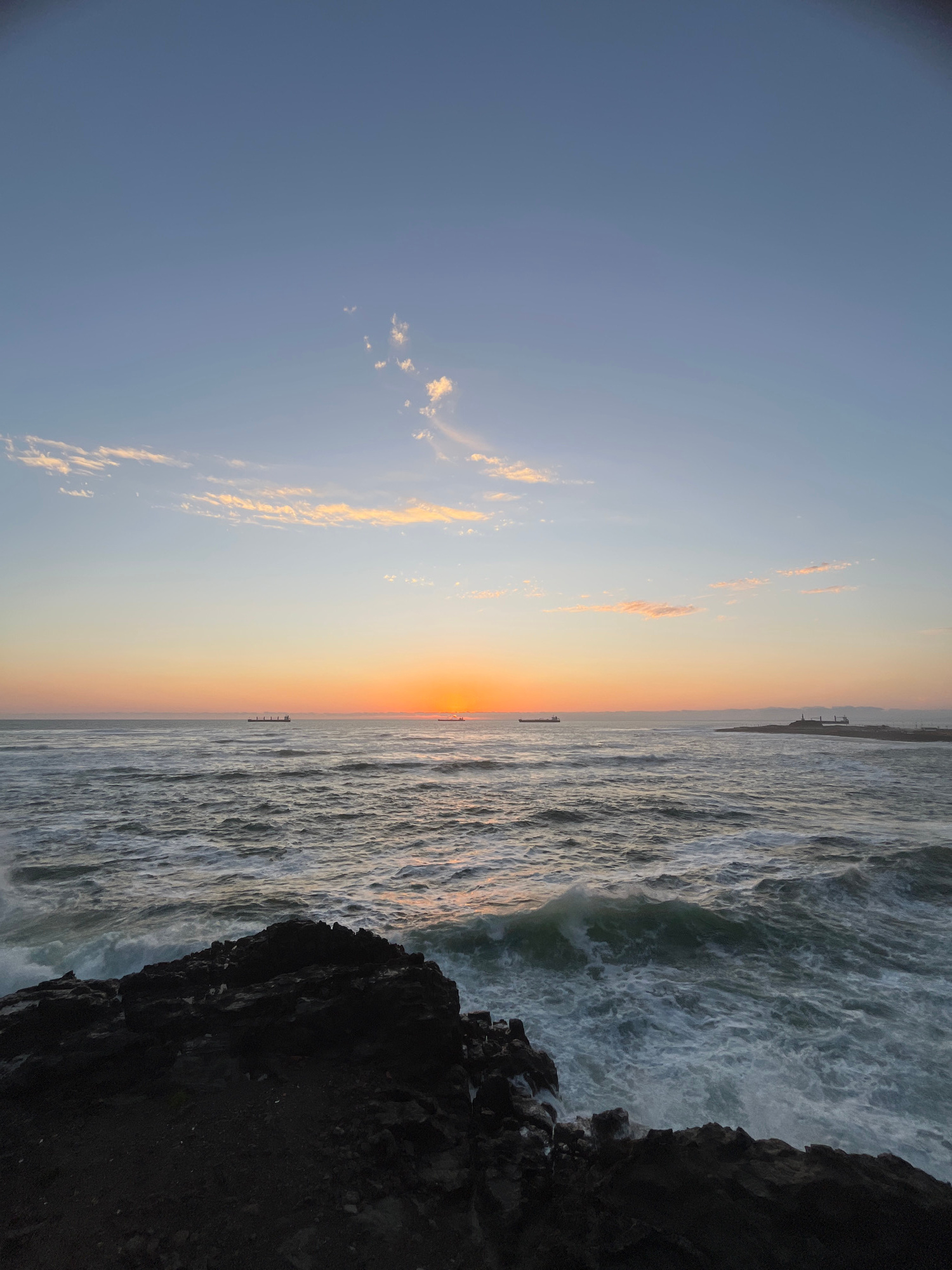 The image shows a sunset view from a rocky coastline in Arica, Chile. The sky transitions from blue to orange as the sun sets over the Pacific Ocean. Several ships are visible on the horizon and close…read more