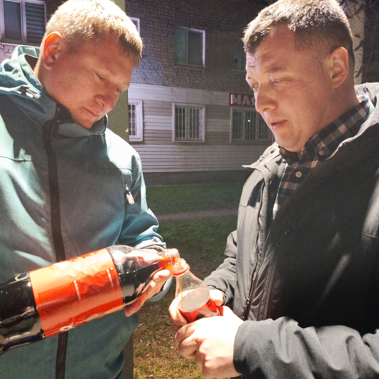Two Caucasian males stand outside an unidentifiable commercial building in Chaikovsky, Russia. The building's facade is pale, with white-framed windows. One individual wears a blue hooded jacket, whil…read more