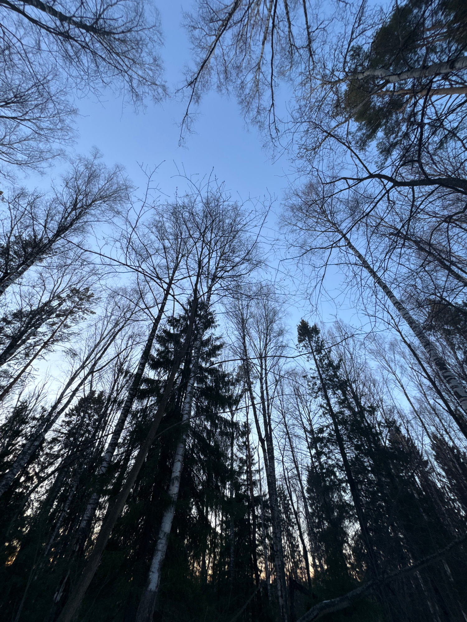 Looking up from the ground, the image captures a view of the sky through a dense forest of bare trees and evergreens. The sky is a pale blue. The trees appear to be located in Вассята, Russia.