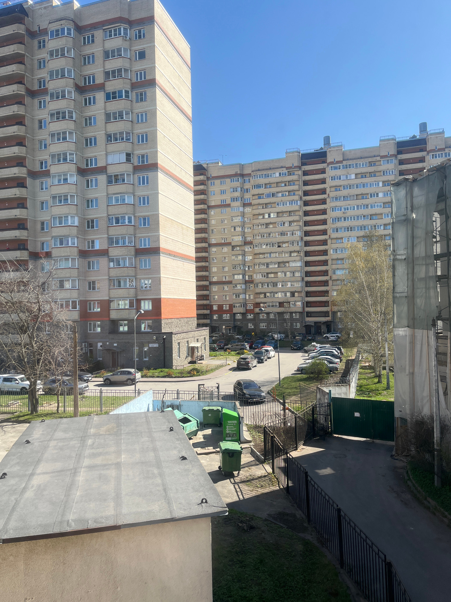 This image presents a bright, sunny daytime view of a residential area in Saint Petersburg, Russia. The scene is dominated by two prominent multi-story apartment buildings under a clear blue sky. The…read more