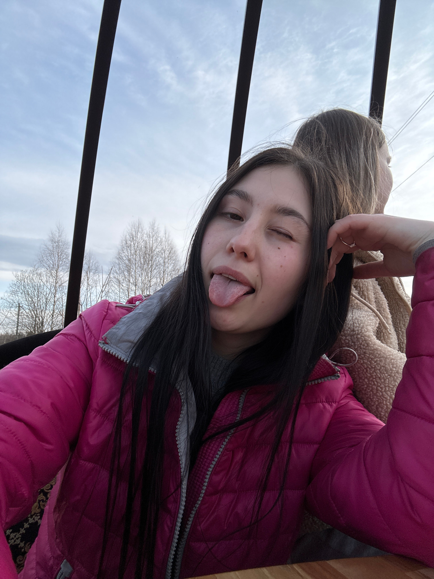 A close-up, diagonally oriented image captures a young person making a playful expression outdoors. The main subject, likely female, has long, dark hair, light skin, and freckles. She is winking with…read more
