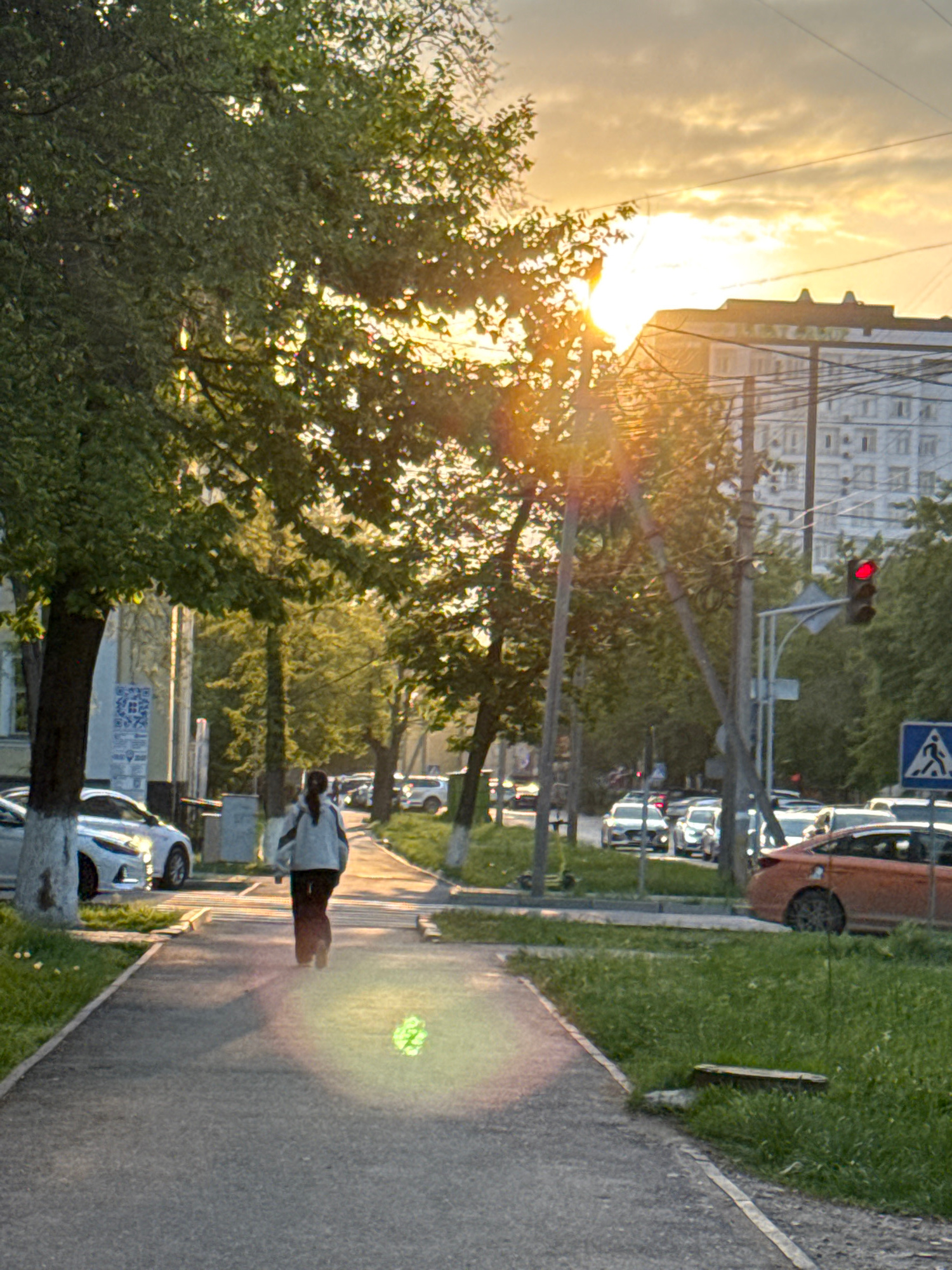 The image shows a street scene in Bishkek City, Kyrgyzstan. A person is walking on the sidewalk. Cars are parked along the street. Traffic lights are visible. A building is in the background. The sun…read more
