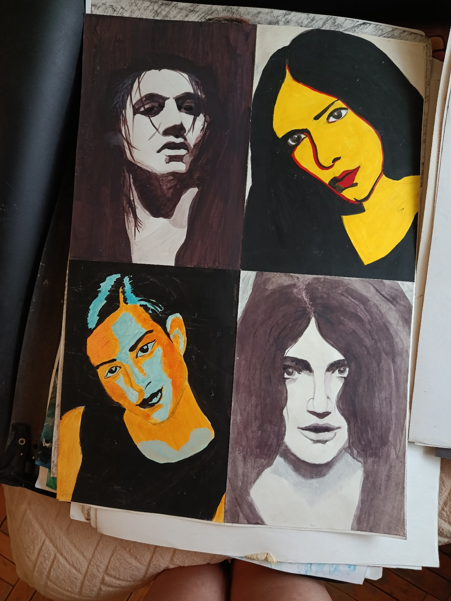 The image shows a piece of artwork with four portraits arranged in a square. The top left portrait is a black and white/brown monochromatic depiction of a person with long dark hair. The top right por…read more