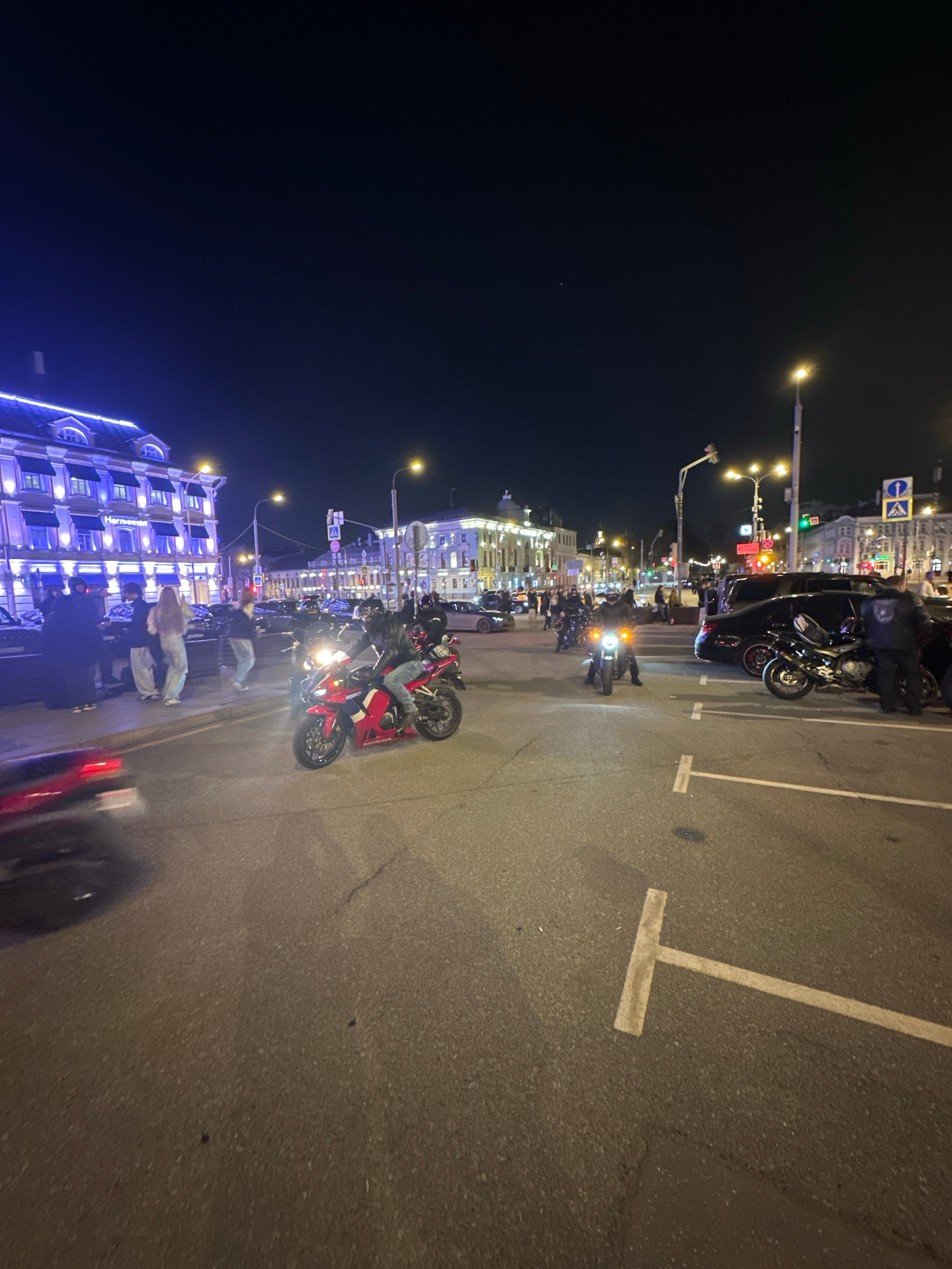 Here is a description of the image: The image shows a nighttime scene in Moscow, Russia, with motorcycles parked along a street in the city center. The scene appears to be bustling with activity, as…read more
