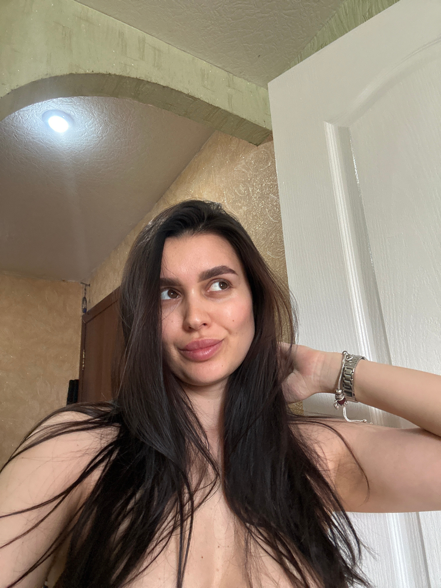 An indoor portrait from Chaikovsky, Russia, features a young woman with long, dark brown hair, lying down or reclining in a relaxed pose. Her head is tilted to the left, and she looks upwards and to t…read more