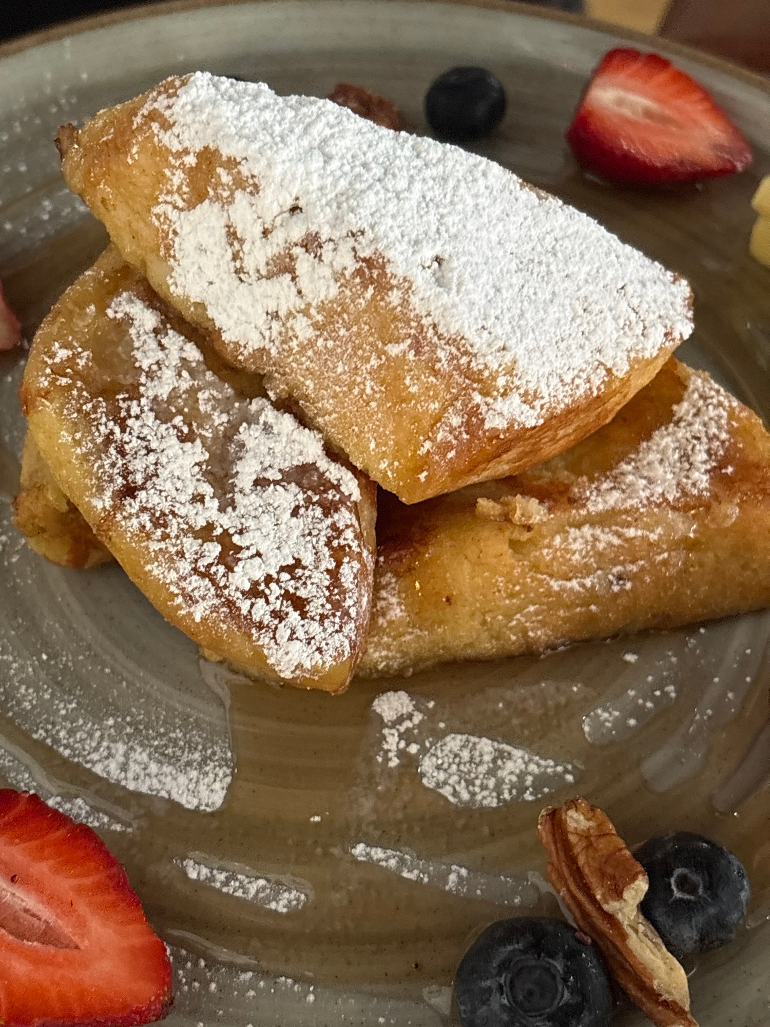A top-down, close-up shot depicts a plate of French toast, dusted with powdered sugar, and garnished with sliced strawberries, blueberries, and a pecan piece. The plate has a neutral color palette, fe…read more